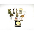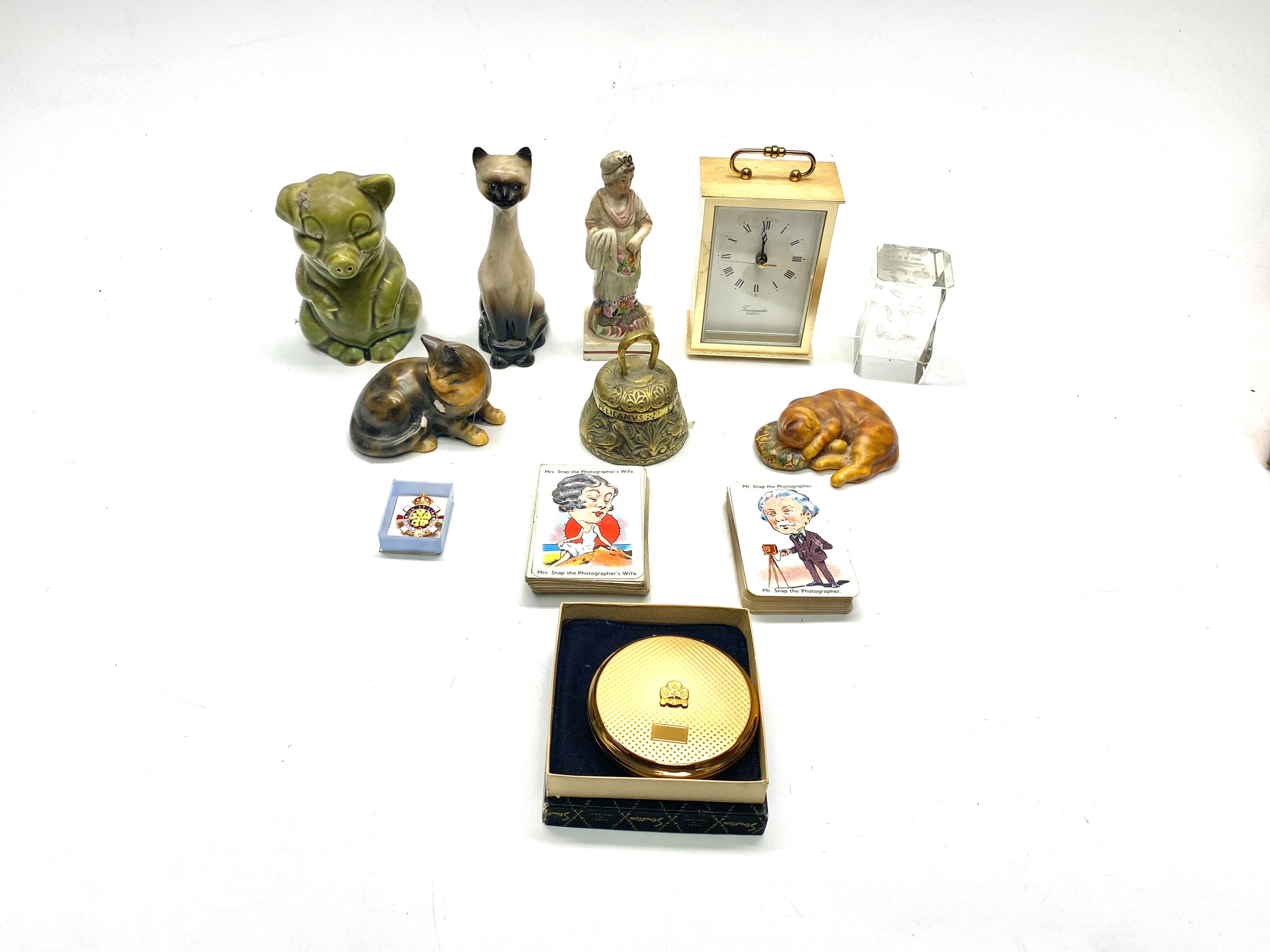selection of curiosities, including Stratton compact, ceramic collectibles and carriage clock.