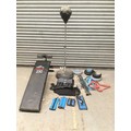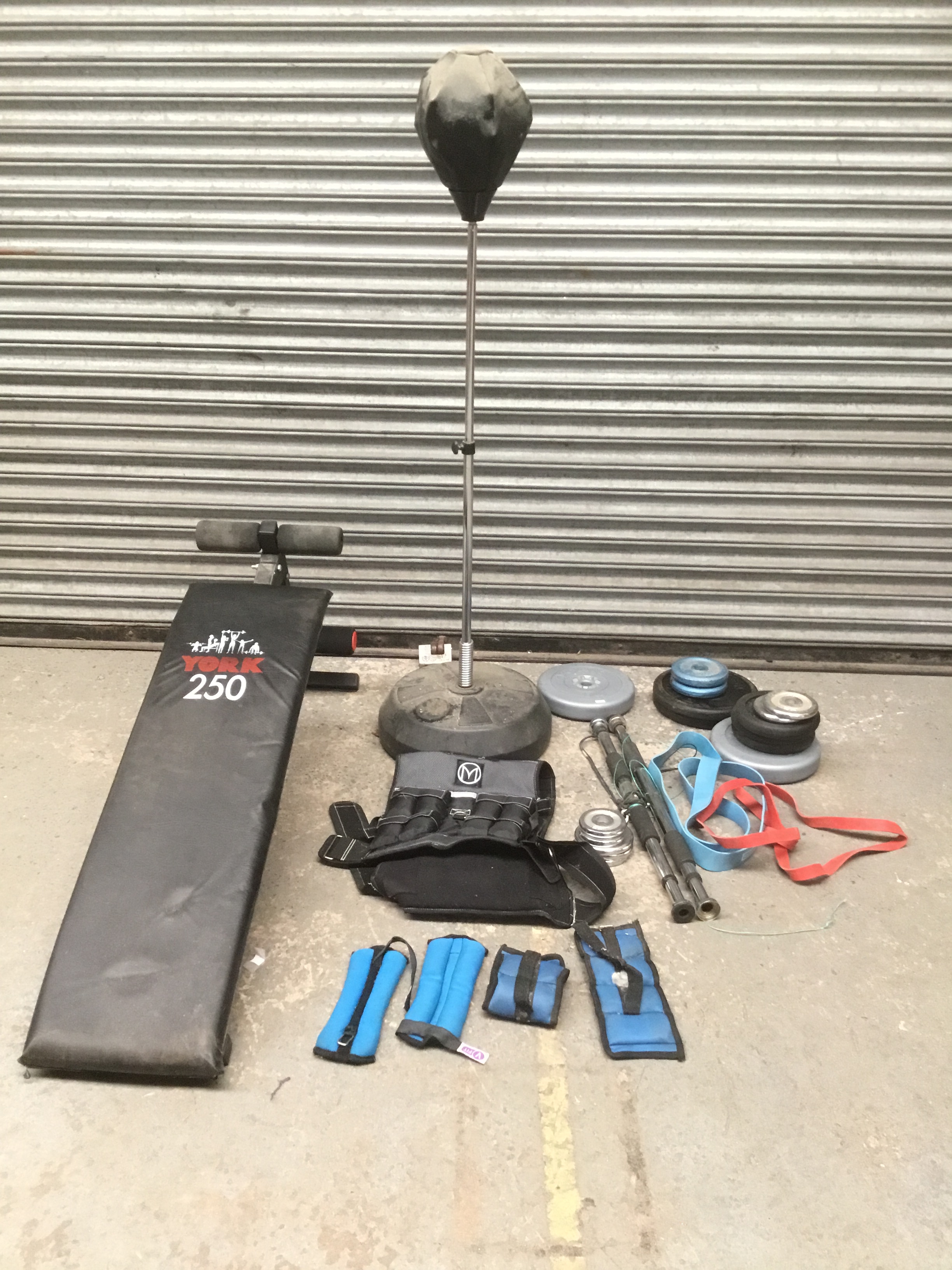 A quantity of exercise equipment including weights, weighted vest, bench and punch ball