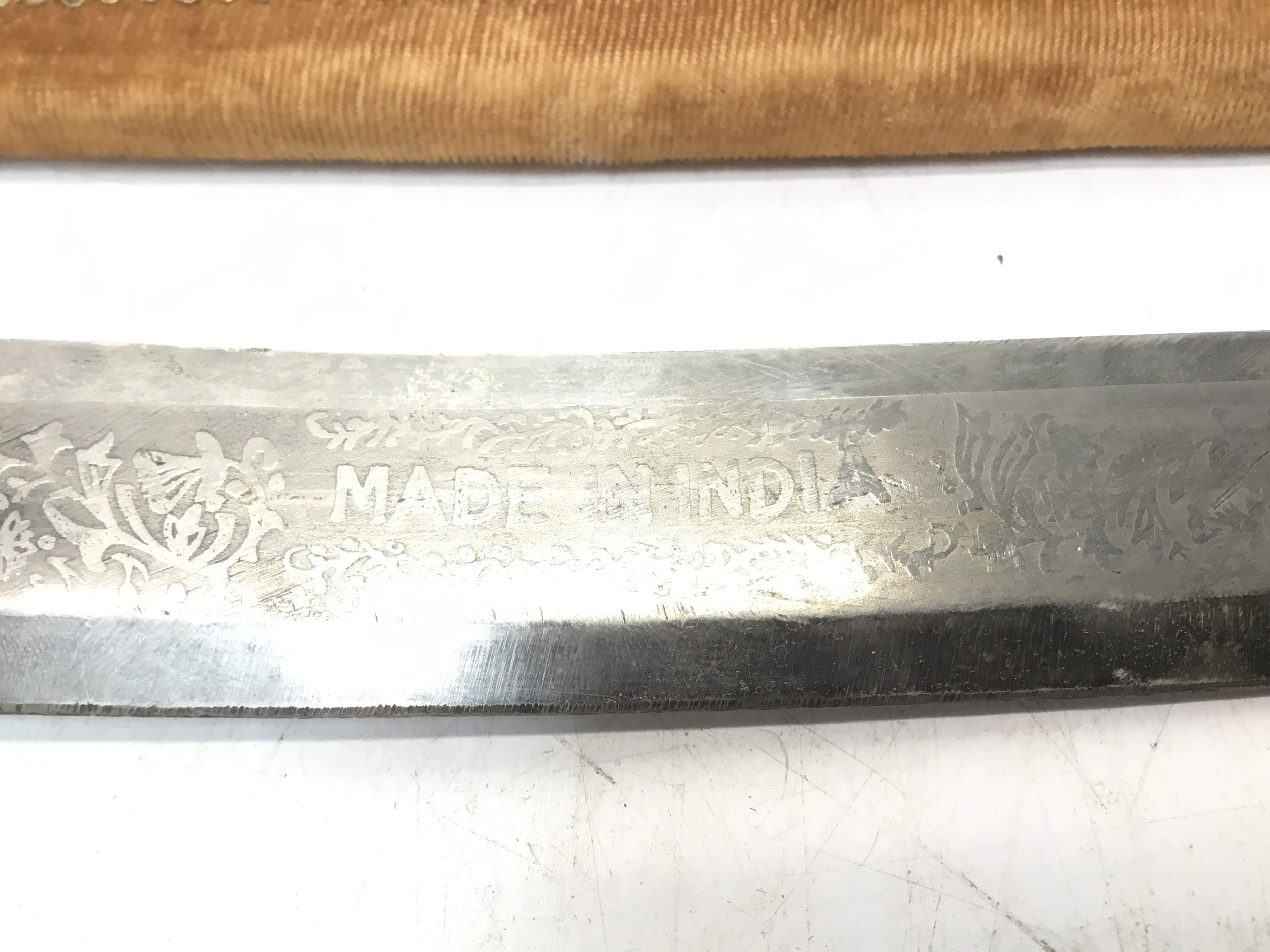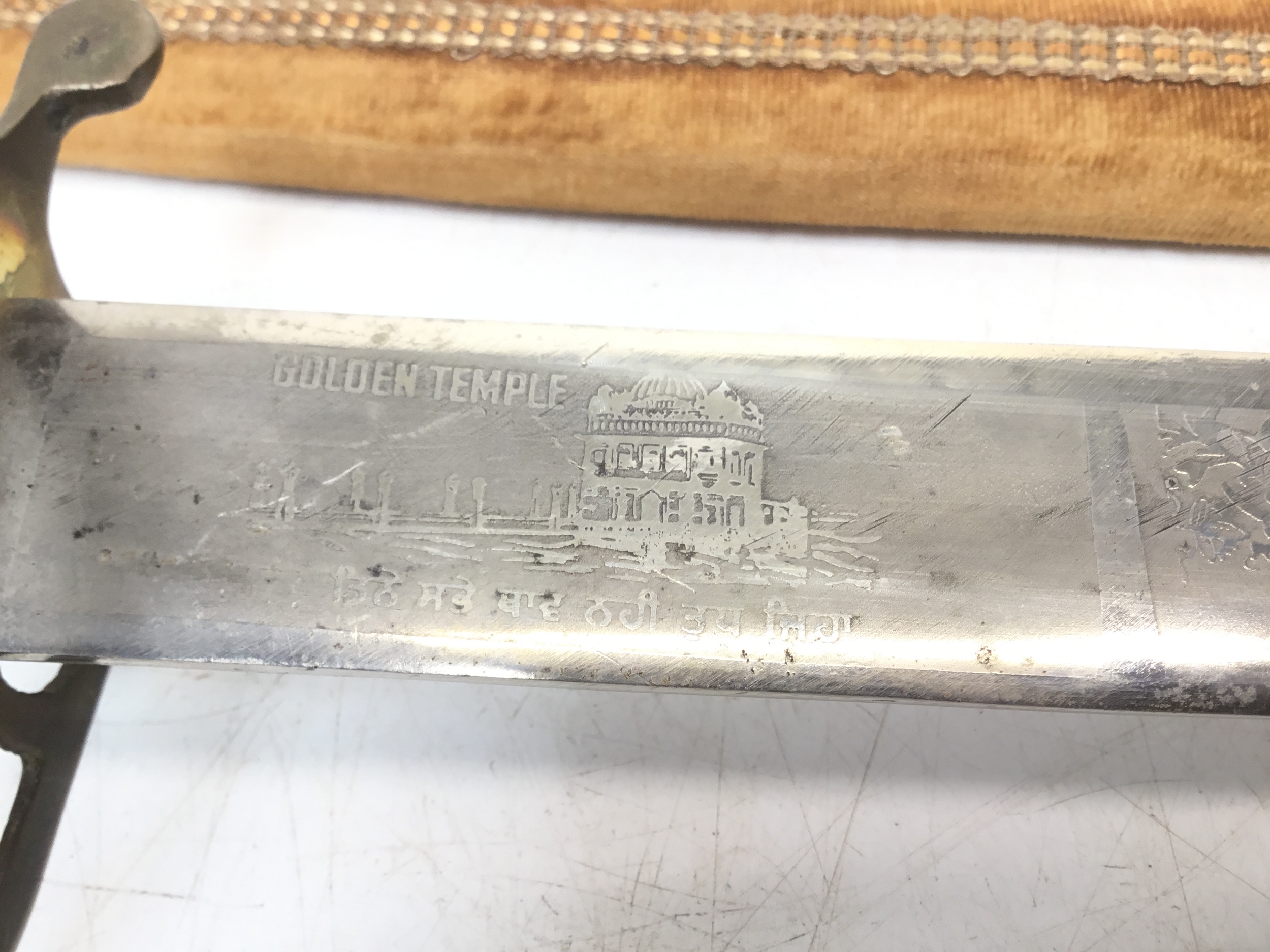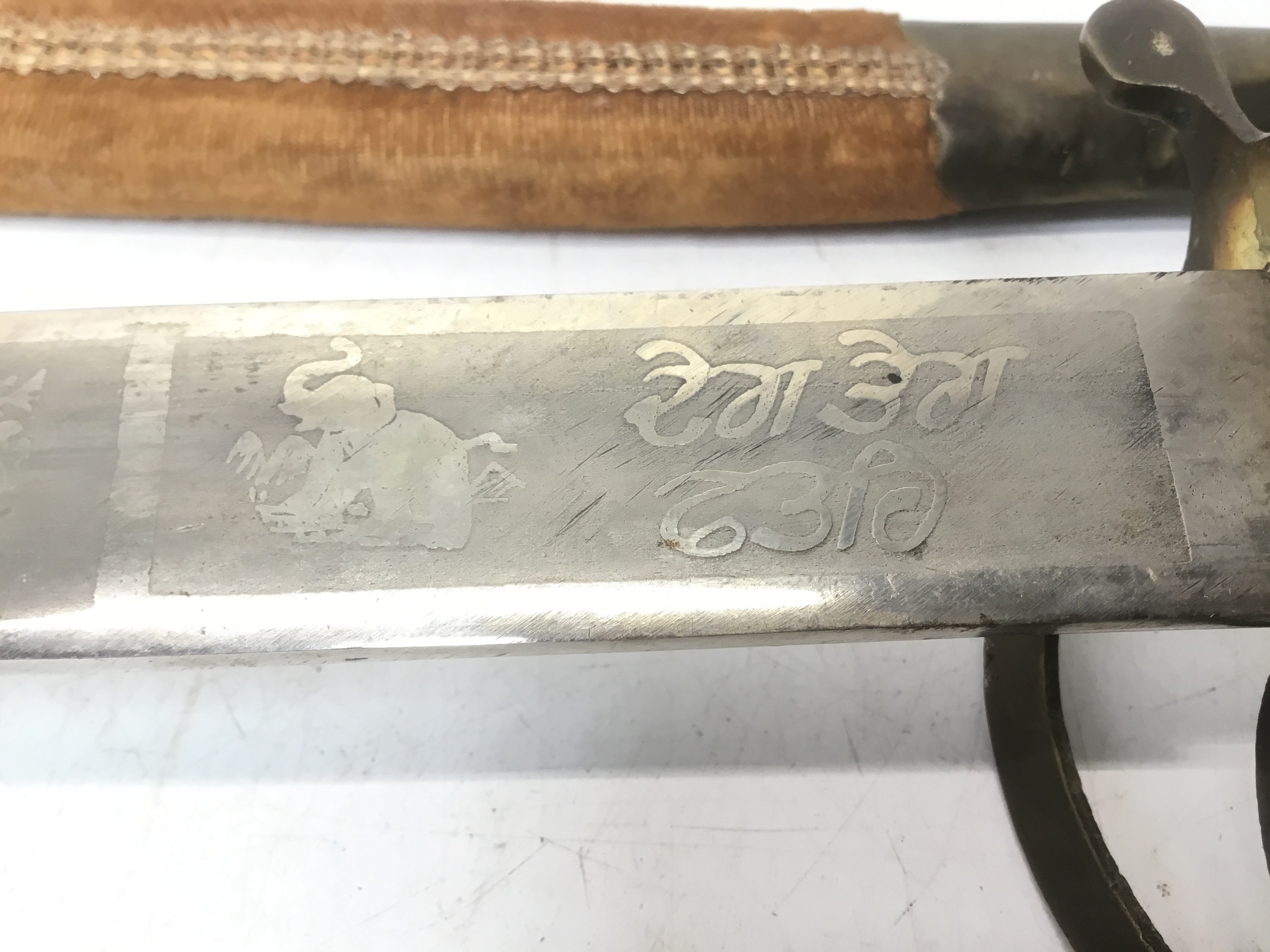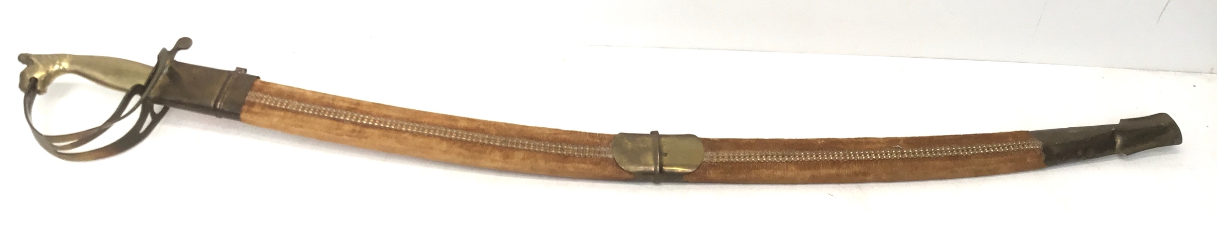 Indian sabre with a brass tiger head handle in a decorative sheath