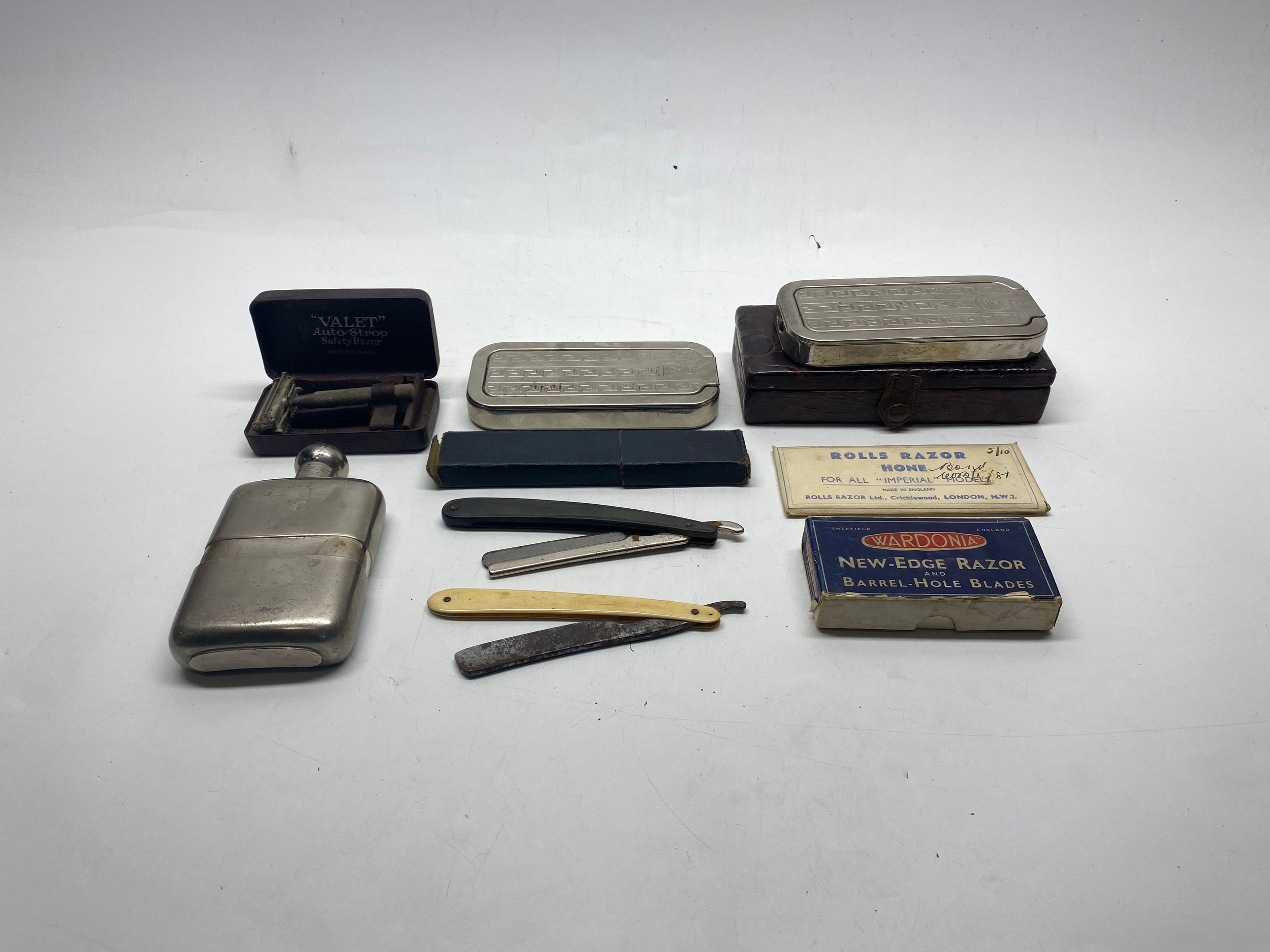 Selection of gentlemen's razors, including a Rolls Razor in a leather case, and a cutthroat razor.