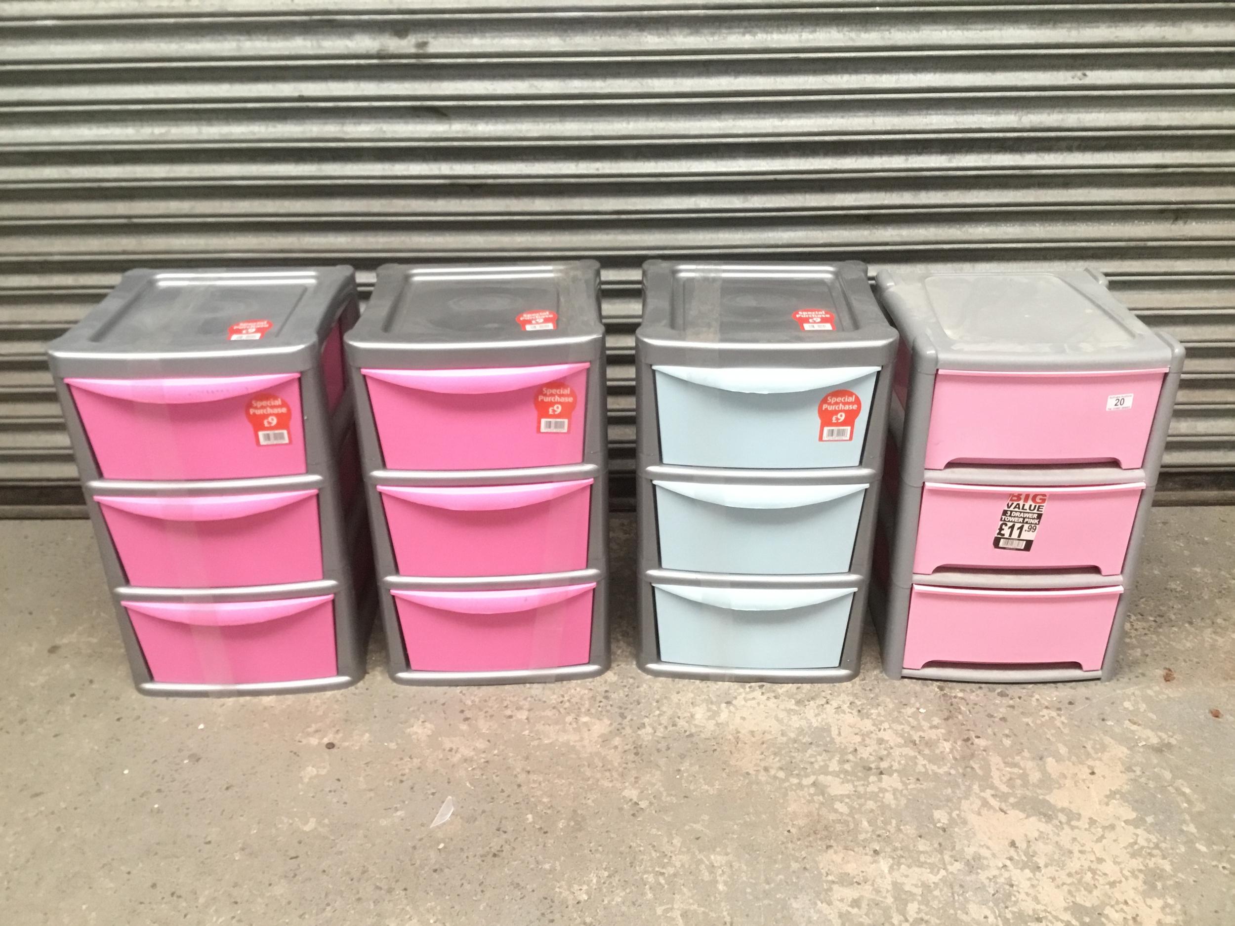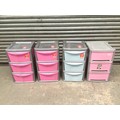 Four sets of three drawer plastic storage drawers