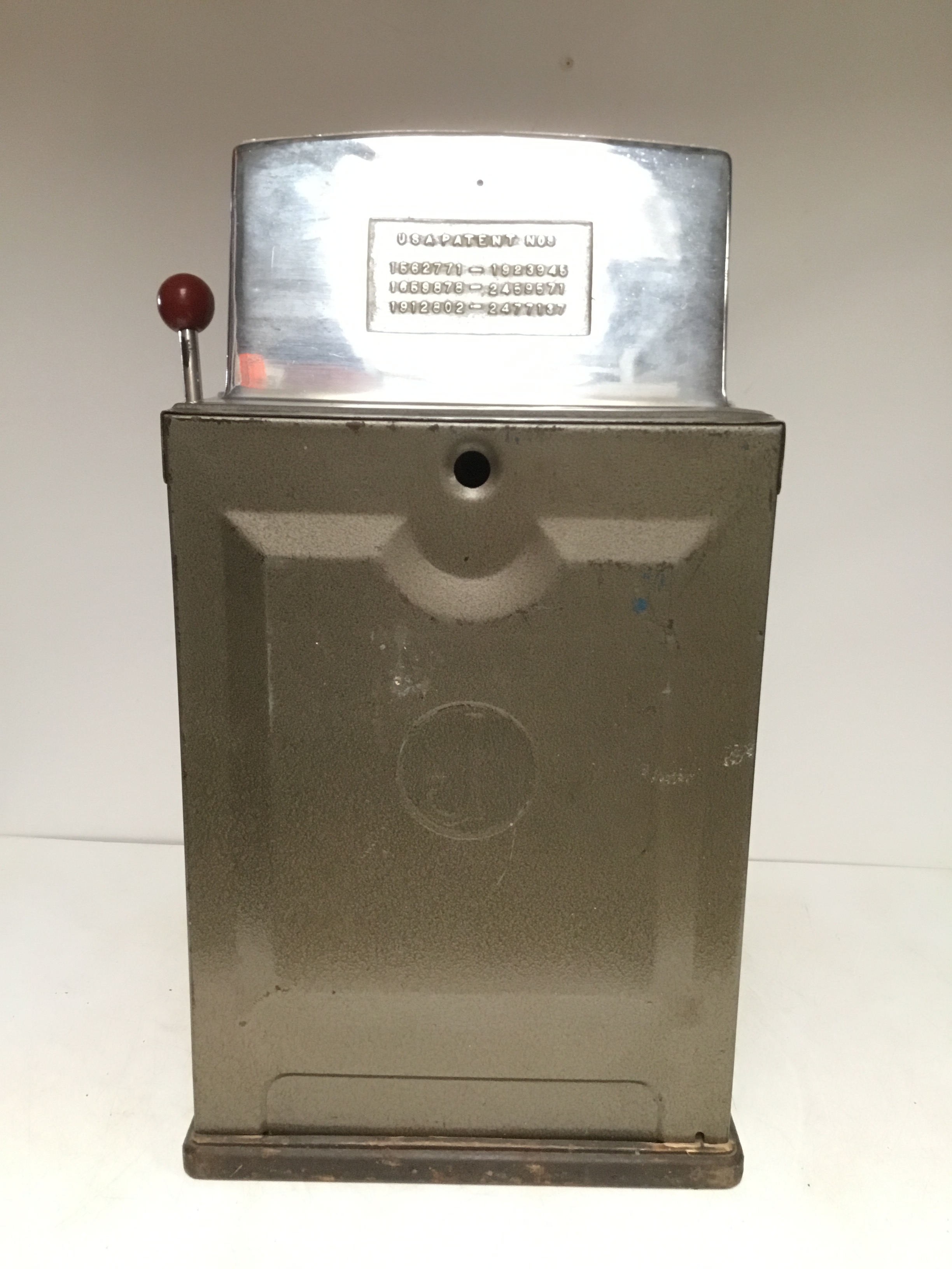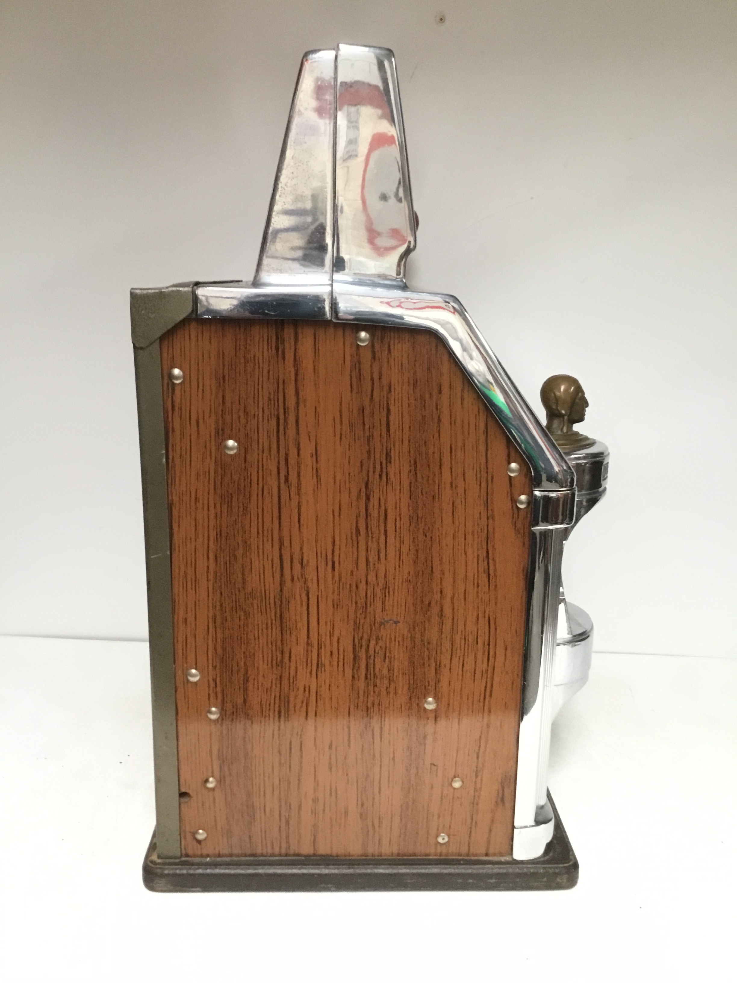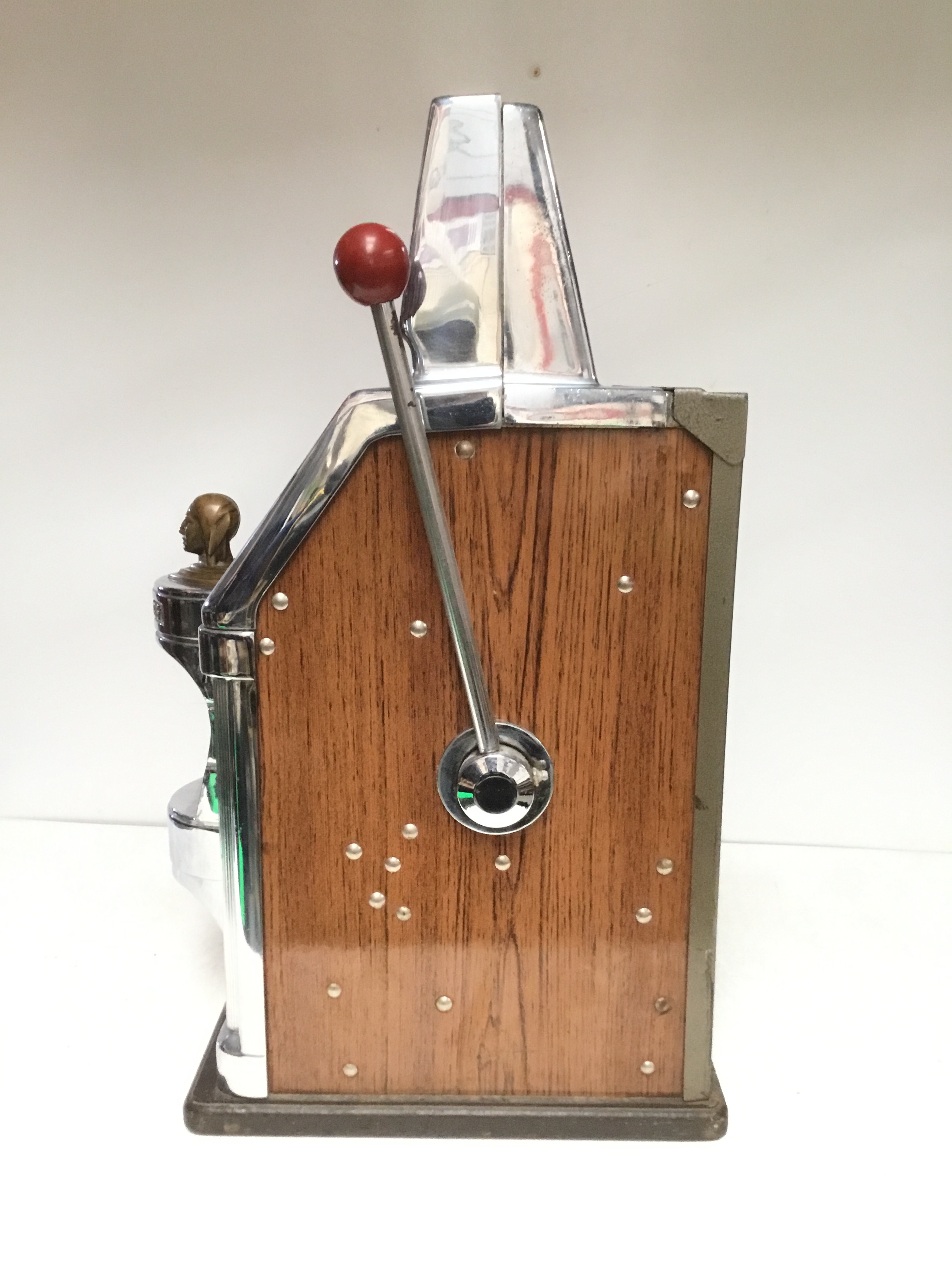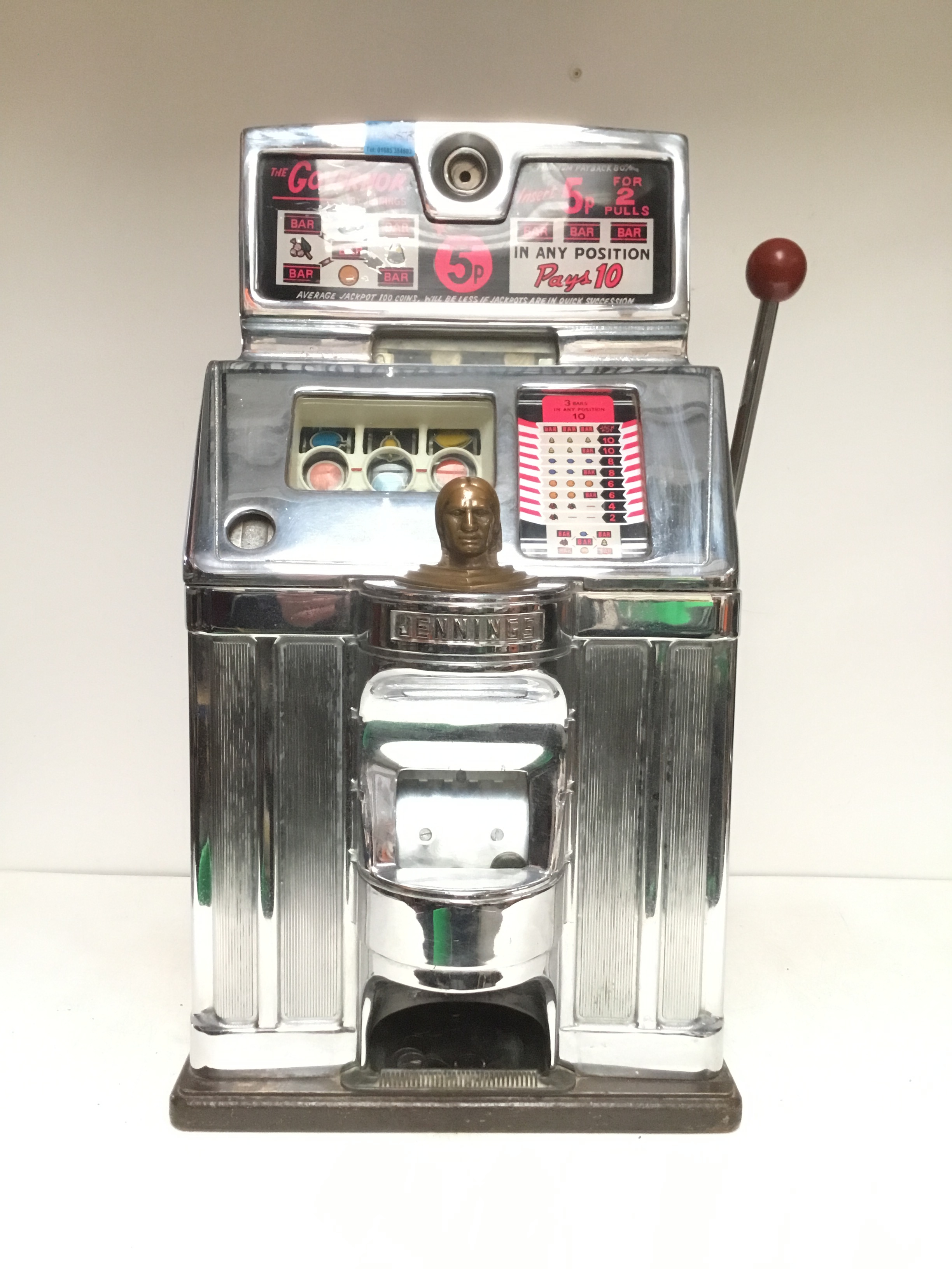 The Governor one armed bandit by Jennings with slot for 5p and featuring a brass Indian head chief on free play but pulls and works