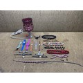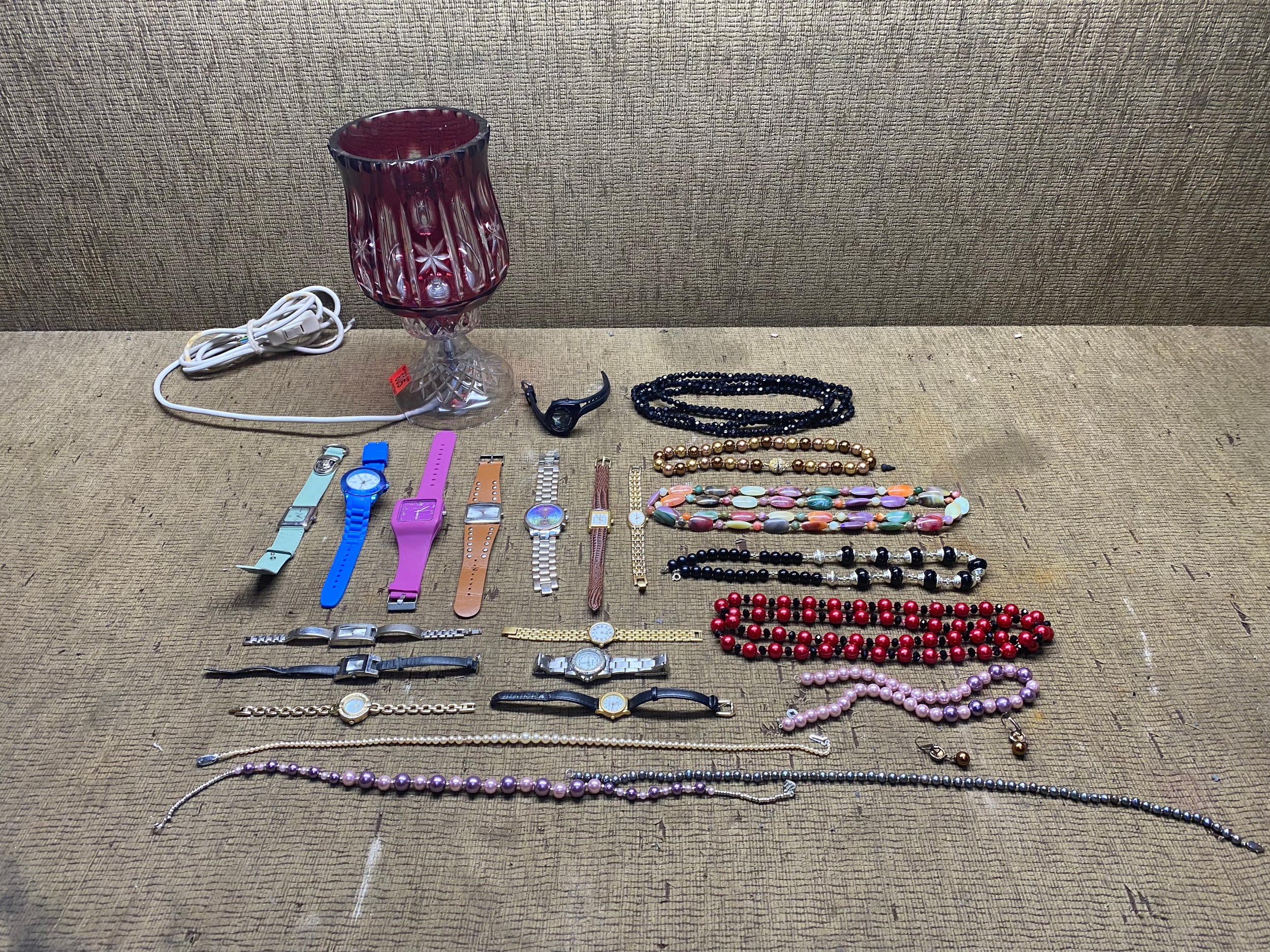 Vintage cranberry glass table lamp 28cm, selection of watches and costume jewellery
