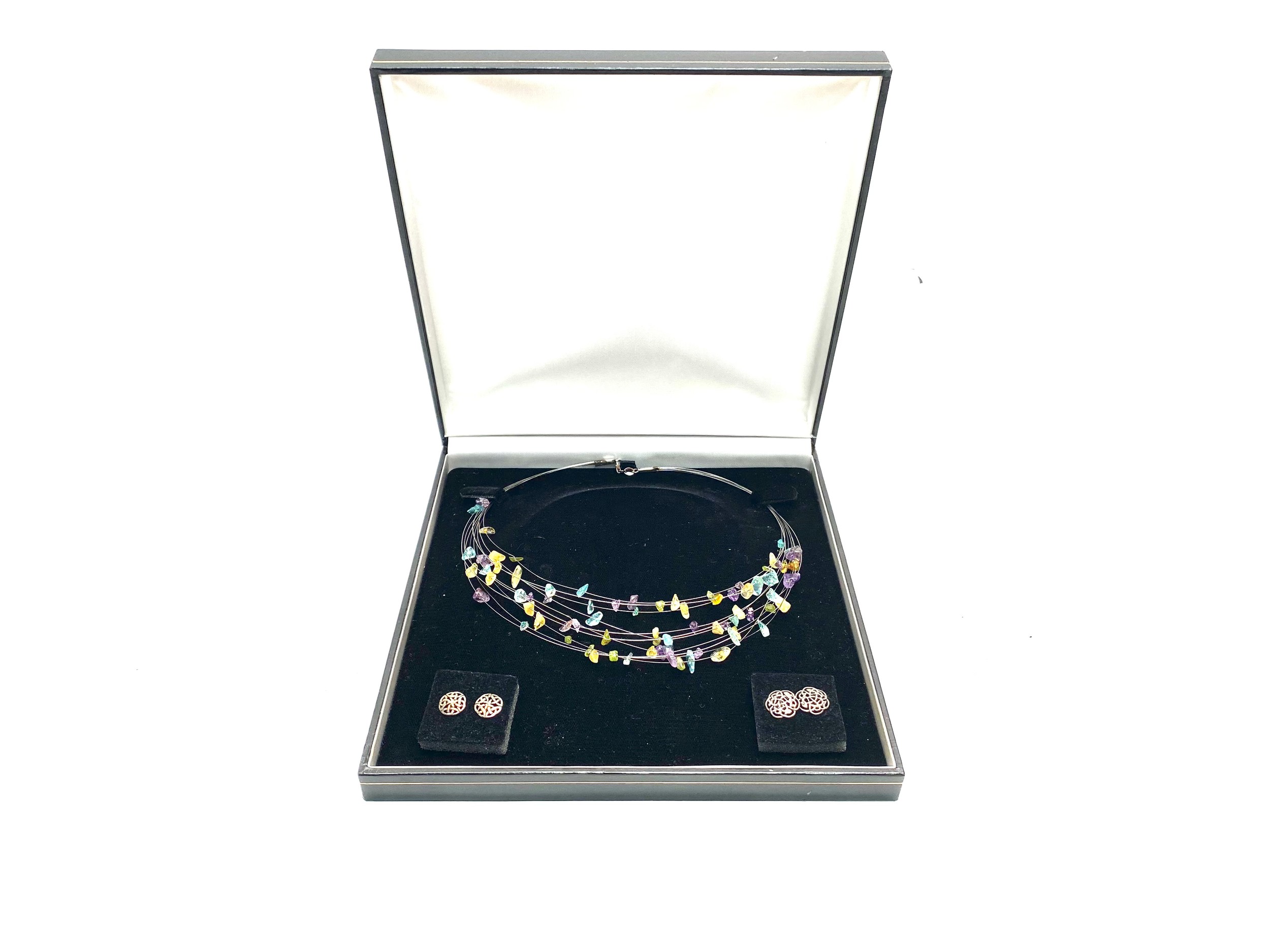 Two pairs of Celtic-style silver earrings and an Italian silver necklace, boxed.