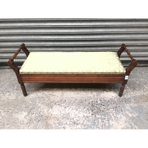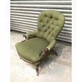 Victorian walnut spoon-back open armchair with button-tufted green upholstery and 19th century Cope and Collinson brass castors