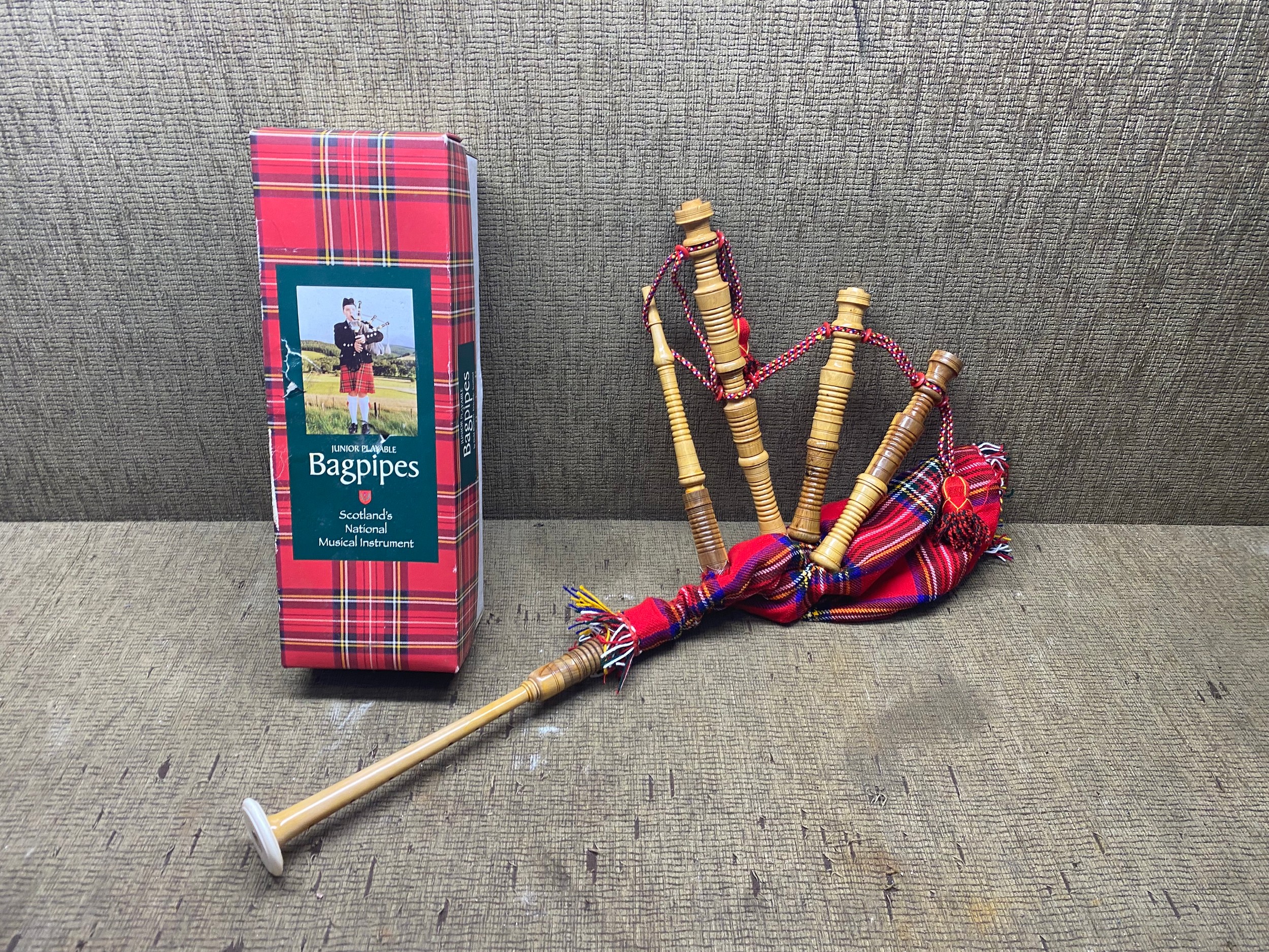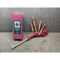 Junior playable bagpipes with Scottish tartan bag.