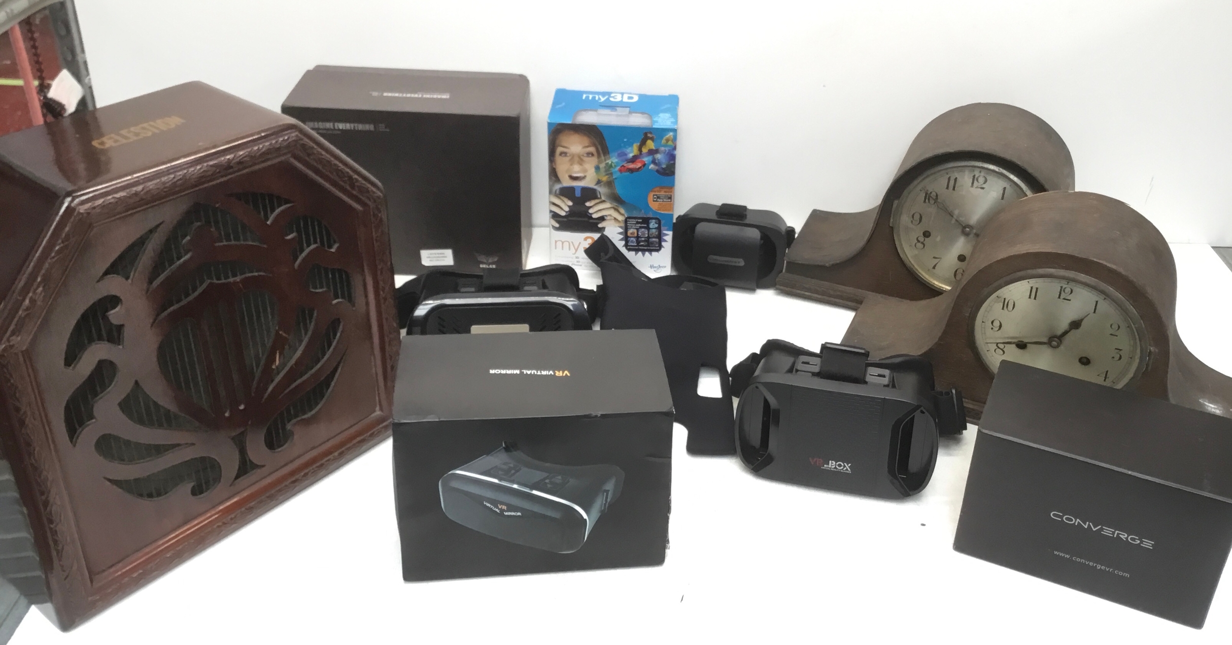 A quantity of VR headsets, two mantle clocks for parts and a vintage Celestion speaker