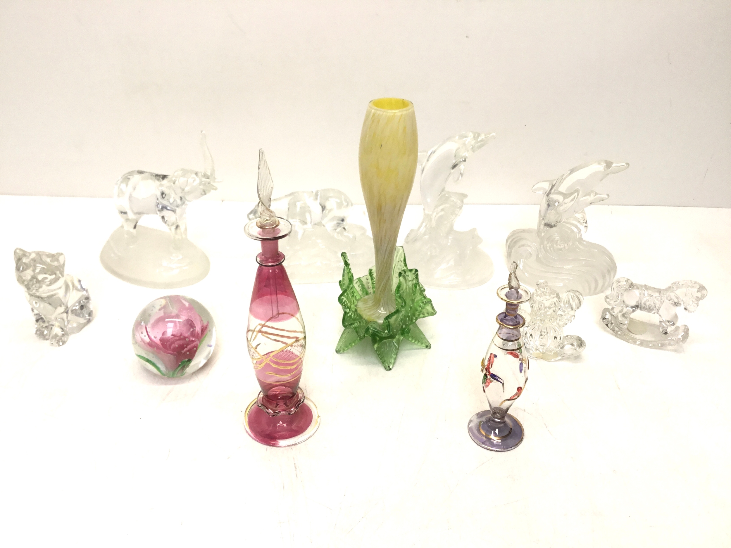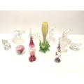 A selection Glass ornaments, including a paperweight and a uranium glass posy vase (leaf chipped)