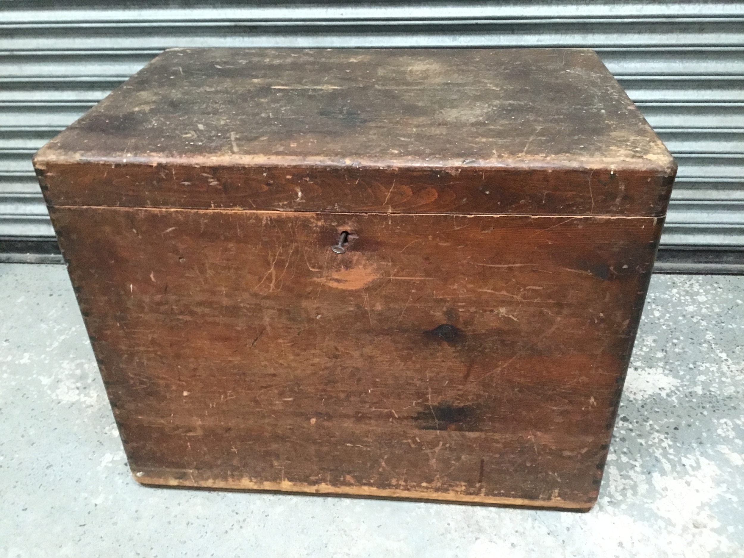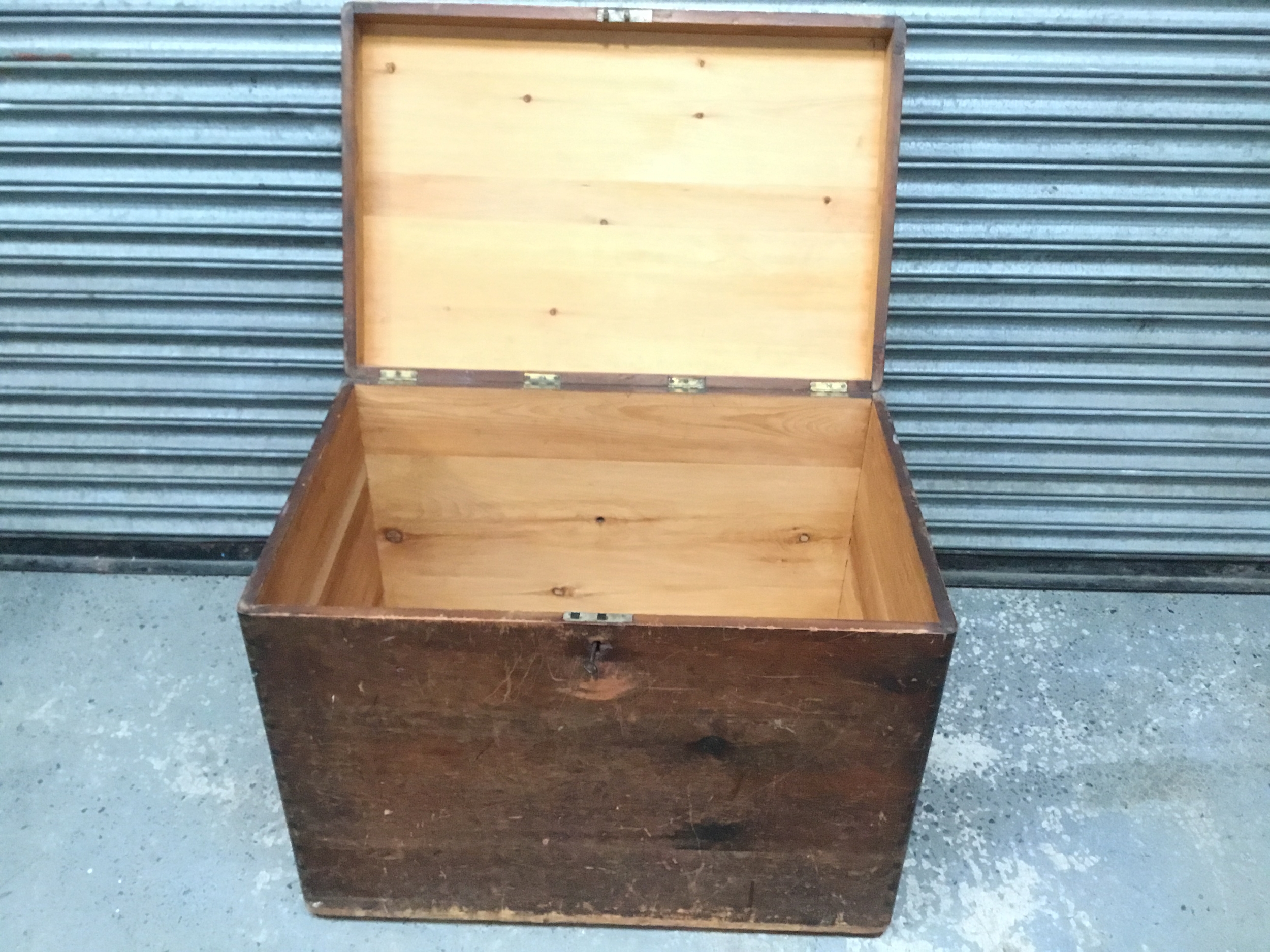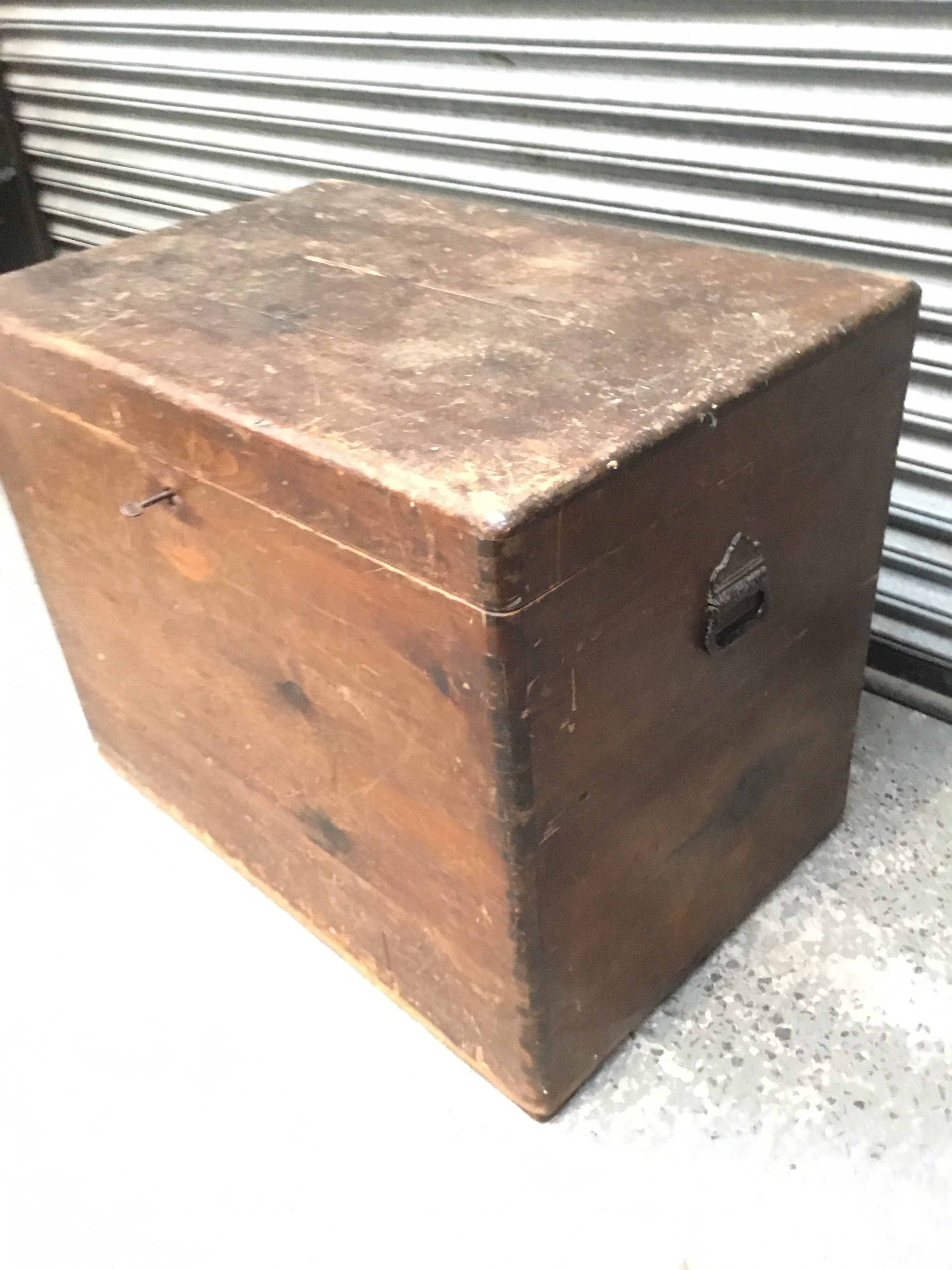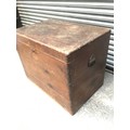 Large antique wooden merchants storage chest with lock and key 92cm x 60cm x 72cm