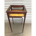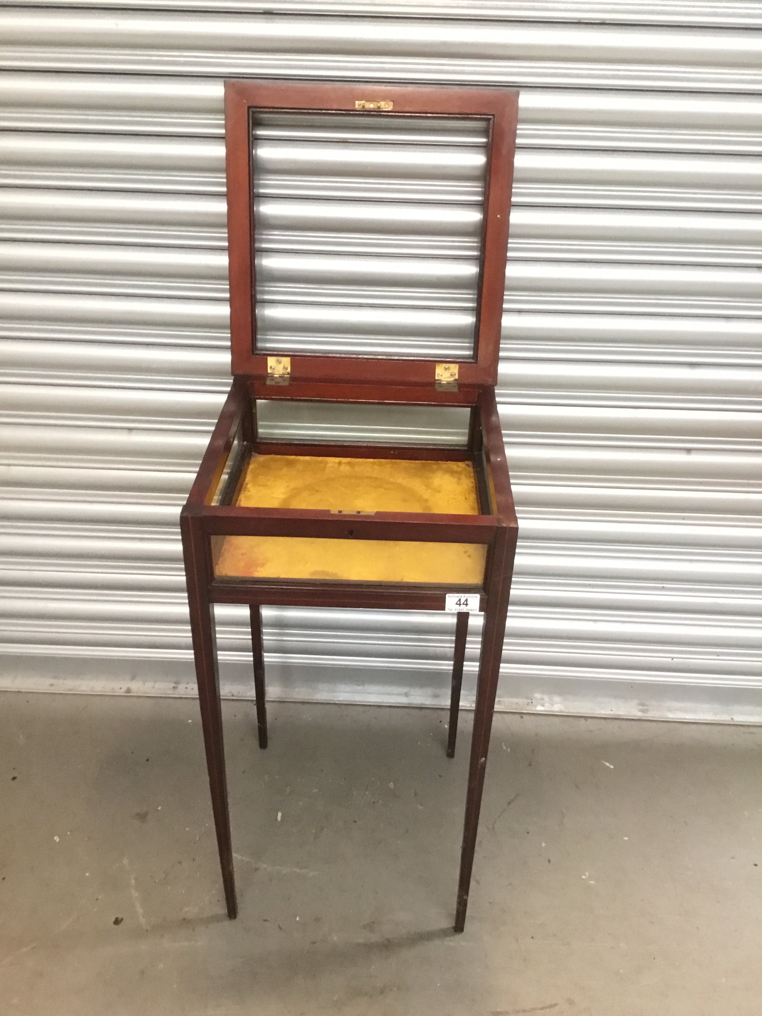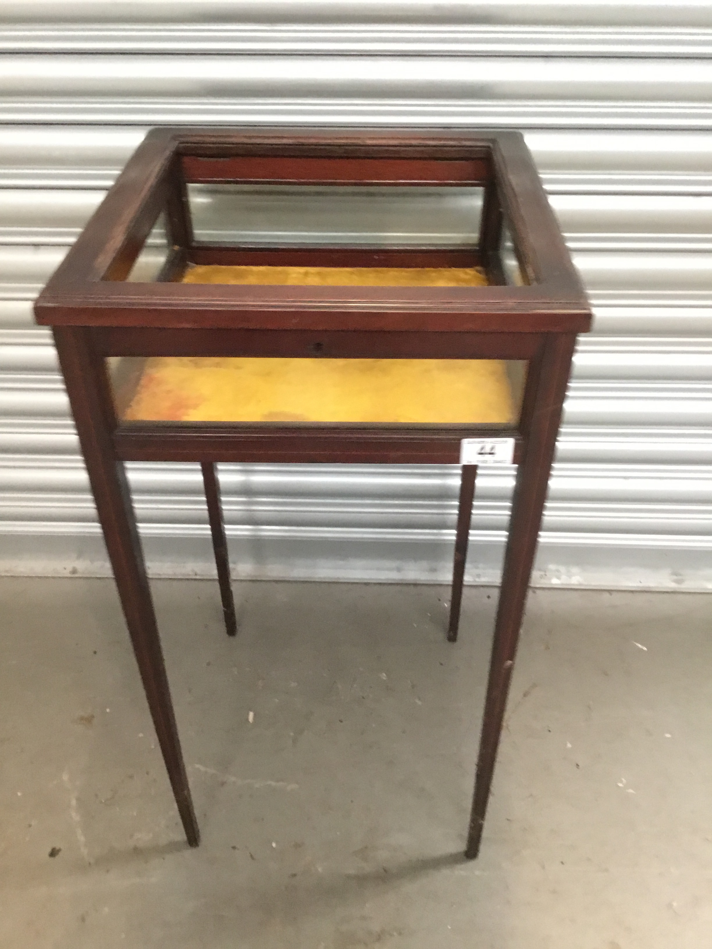Antique inlaid mahogany bijouterie table with gold felt lining (top glass missing) 76cm x 38cm