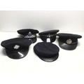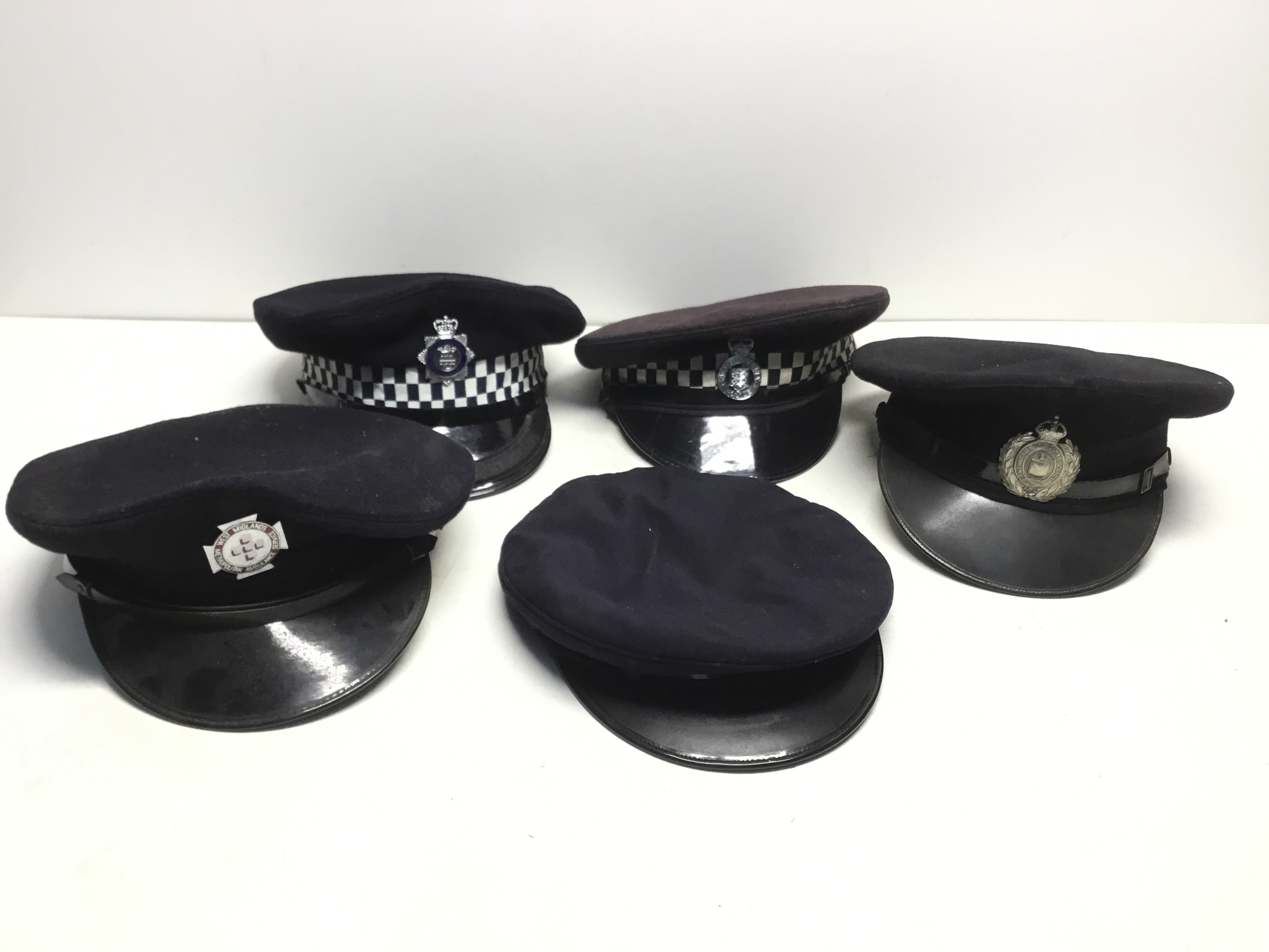 Vintage police caps including Jersey, Newport, Cambridge and West Midlands Ambulance service