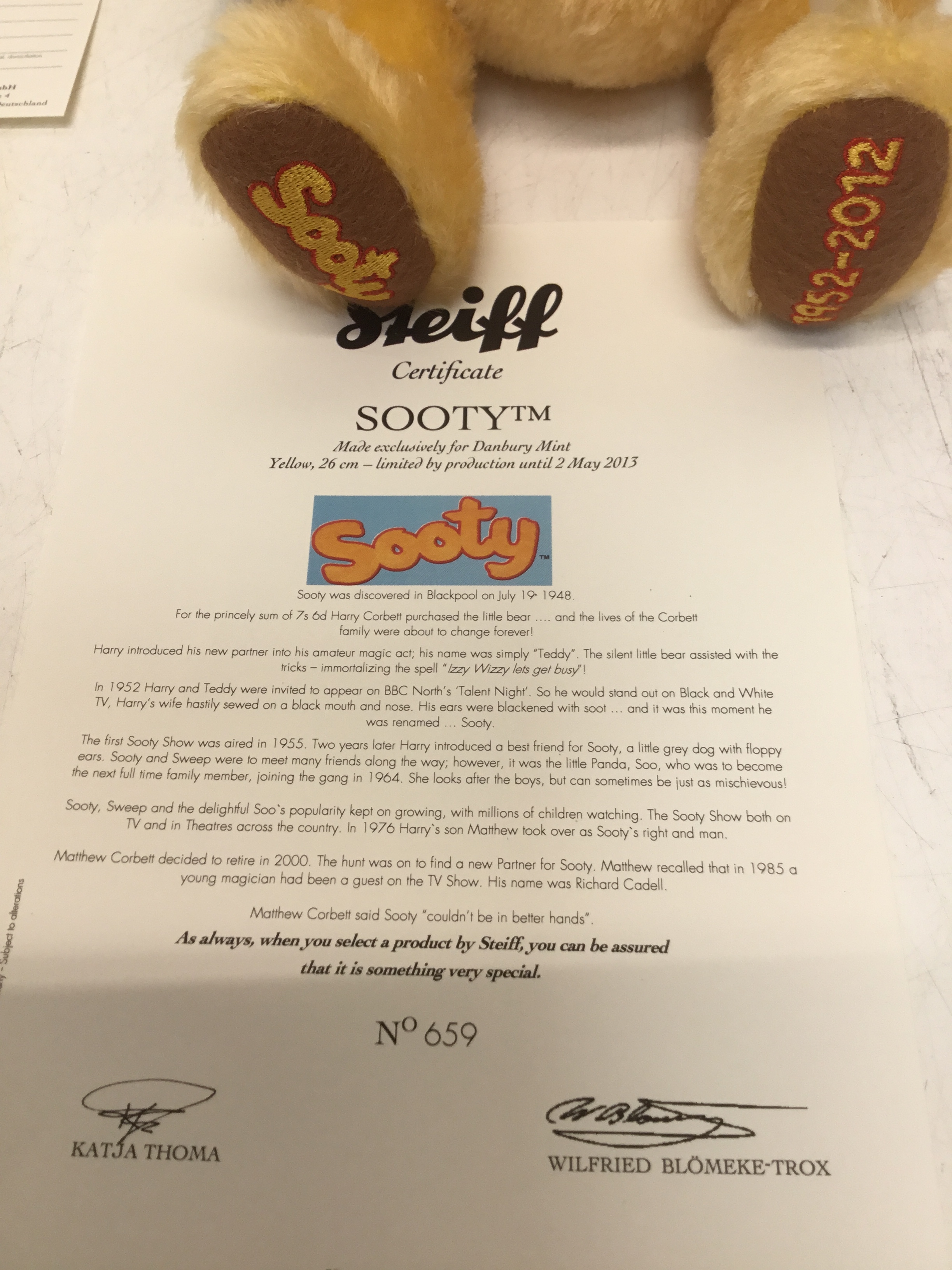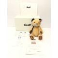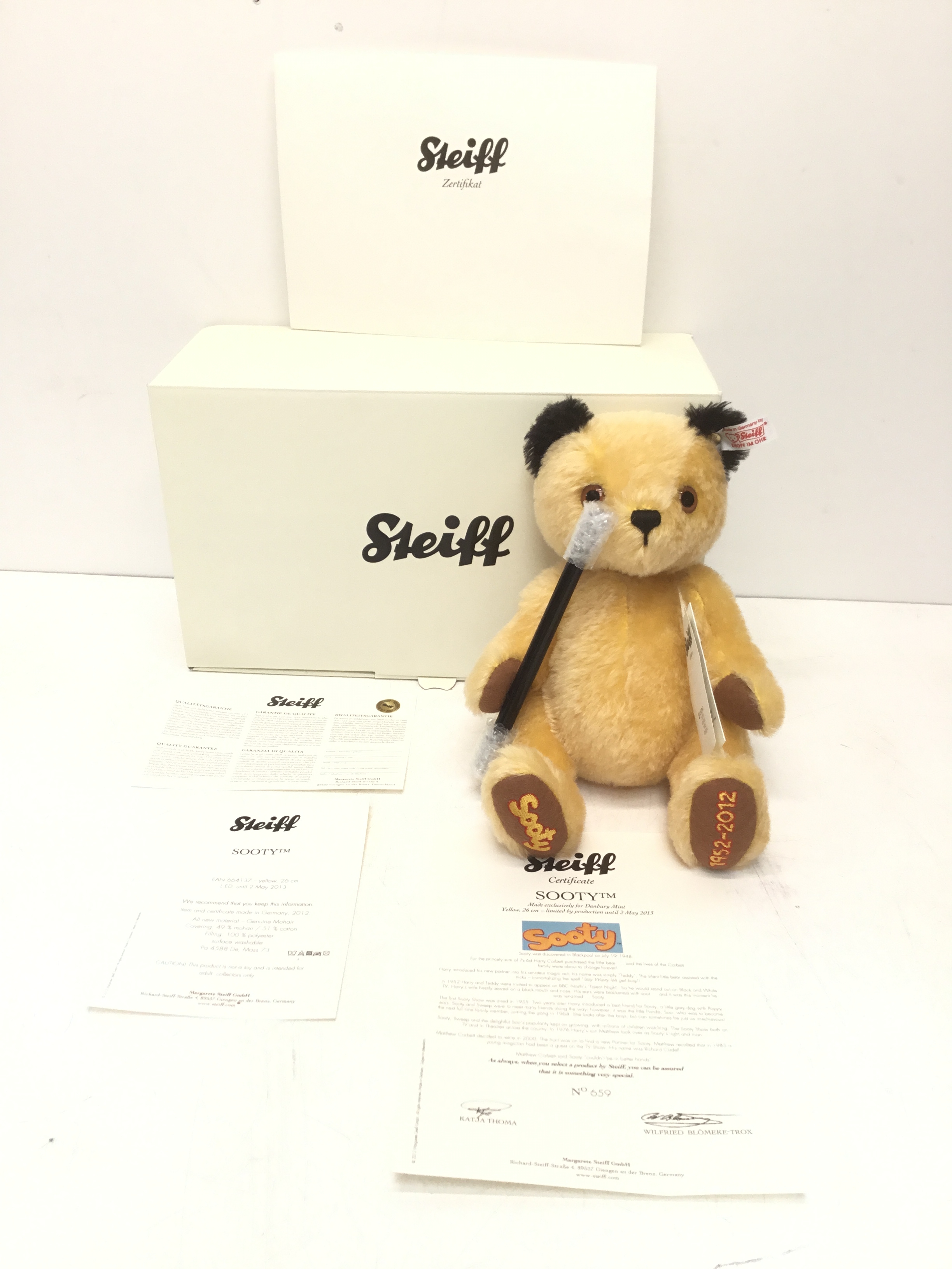 A boxed Steiff limited edition "Sooty" teddy bear, jointed with black and yellow mohair and cotton 'fur', holding a magic wand, gold coloured ear button and white label no 664137, limited edition no 659 (produced until 02/05/2013) with certificate, swing tags attached, height approximately 26cm