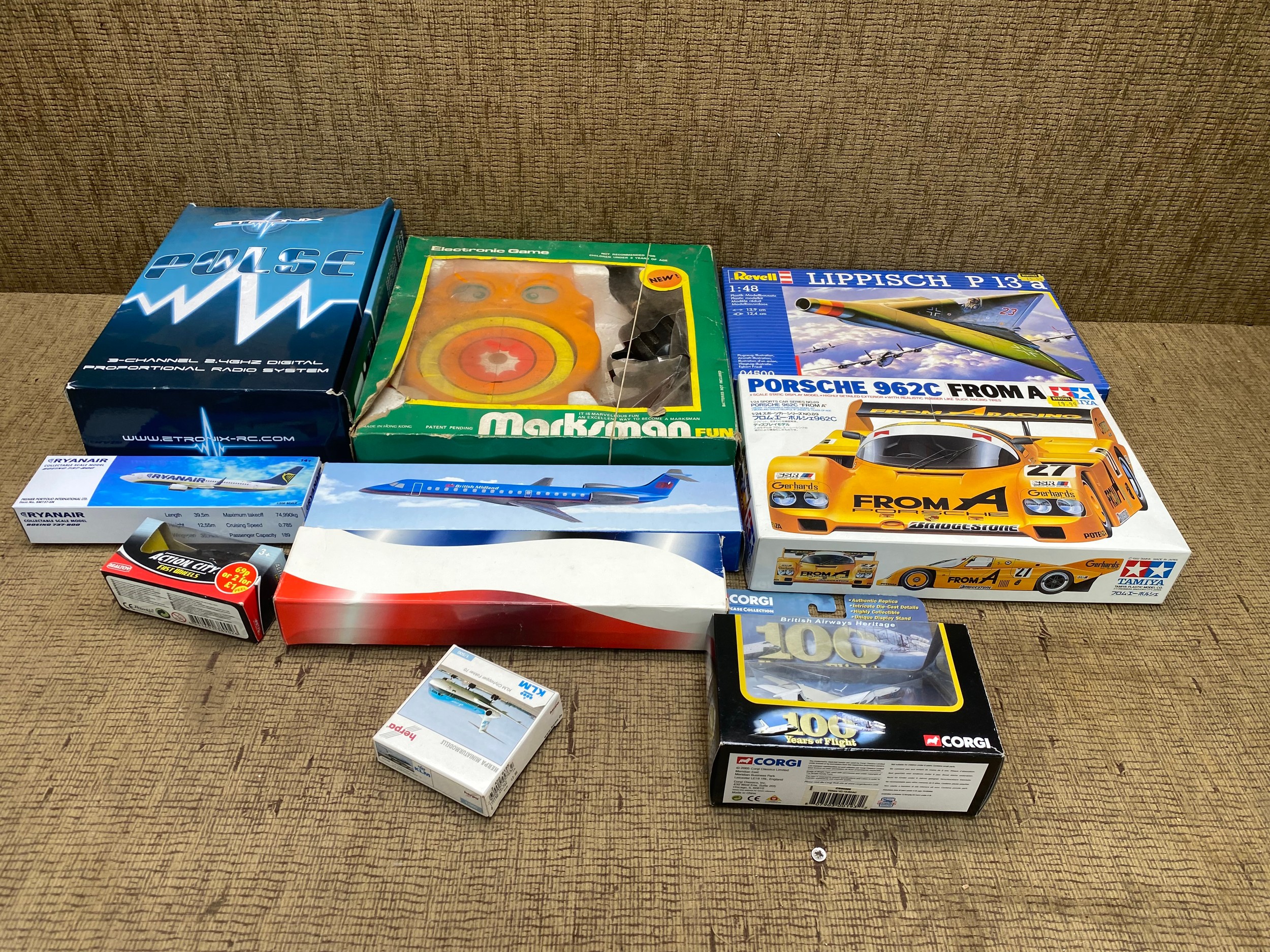 mixed collection of models including revell, tamiya and a marksman game.