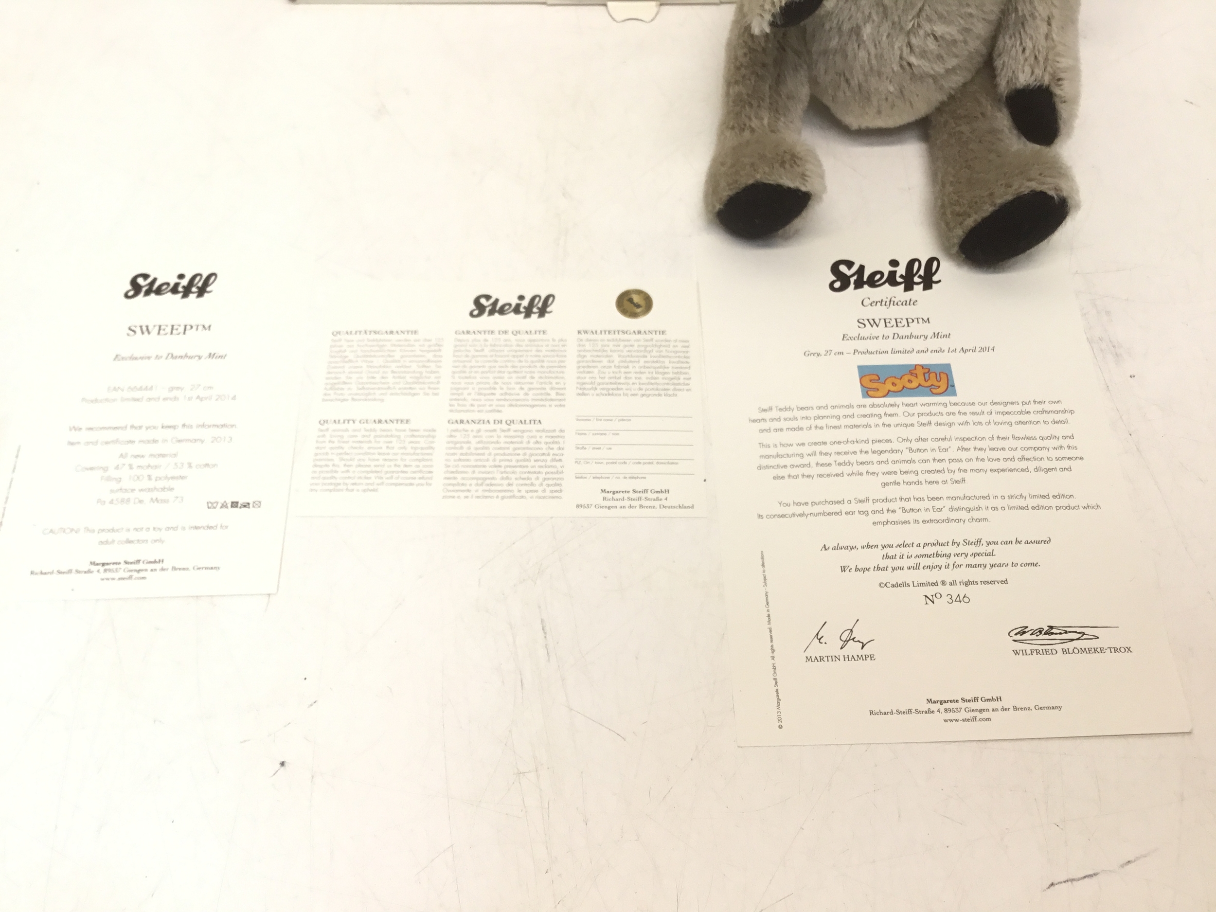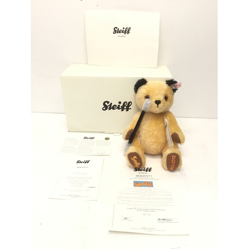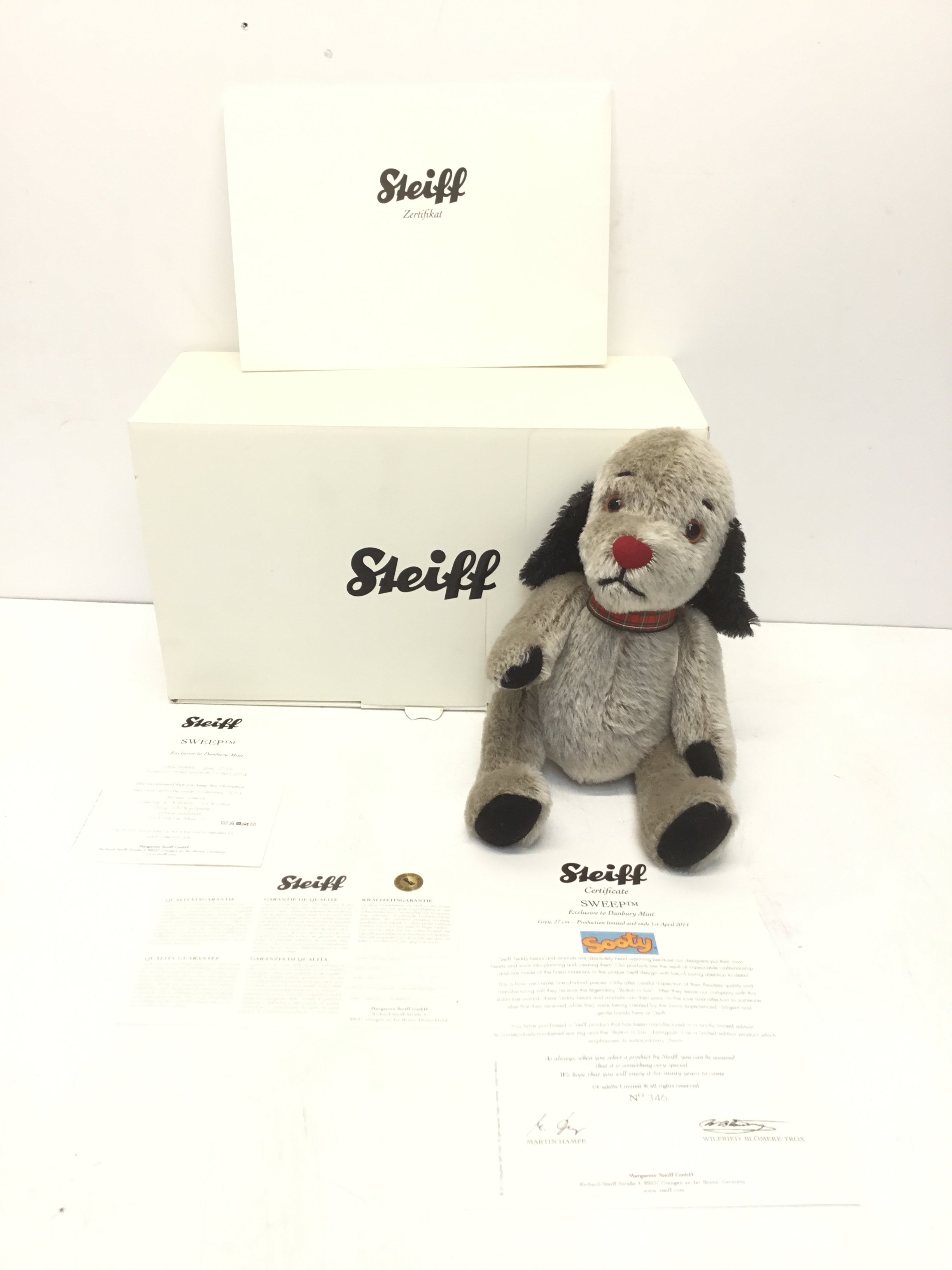 A Modern Steiff Jointed Bear "Sweep" #664441 From The Sooty TV Show. Exclusive To Danbury Mint No.346. With Tag and Swing Label. Boxed With Certificate and Other Paperwork. Approximately 27cm Tall.