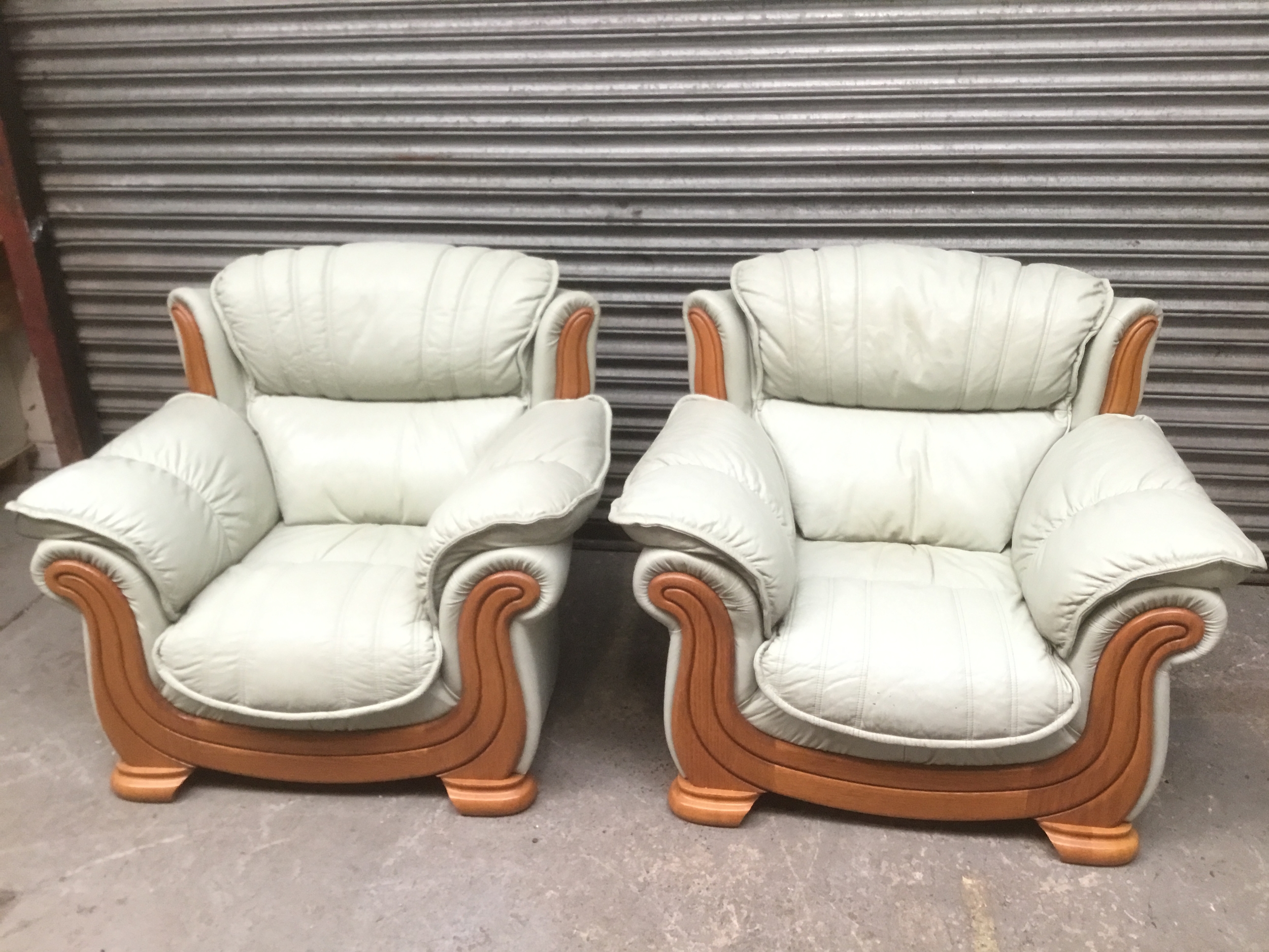A pair of light green leather armchairs made in USA