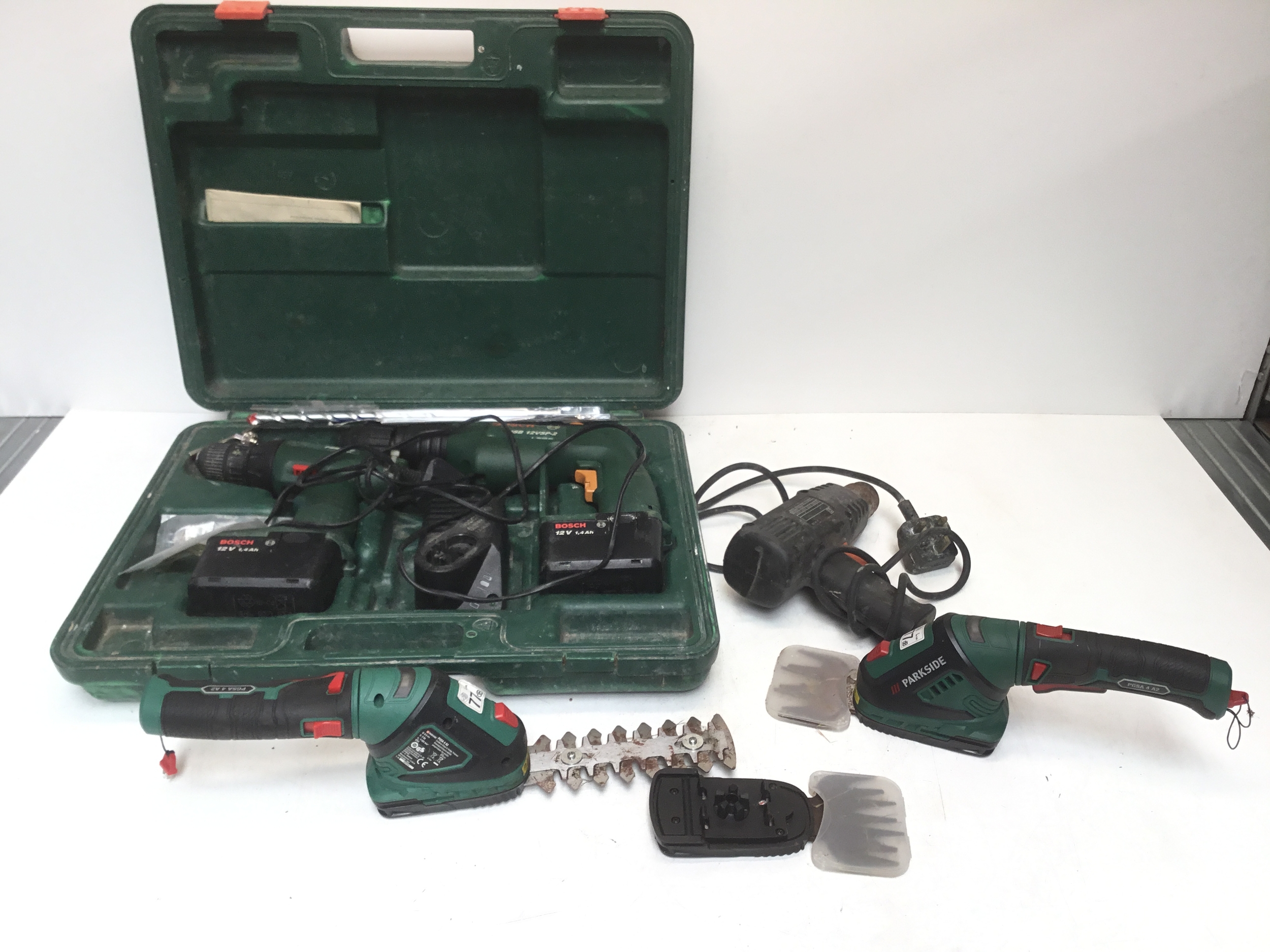 Boxed cordless bosh drill set and a selection of battery tools