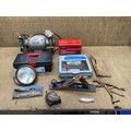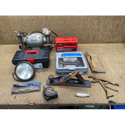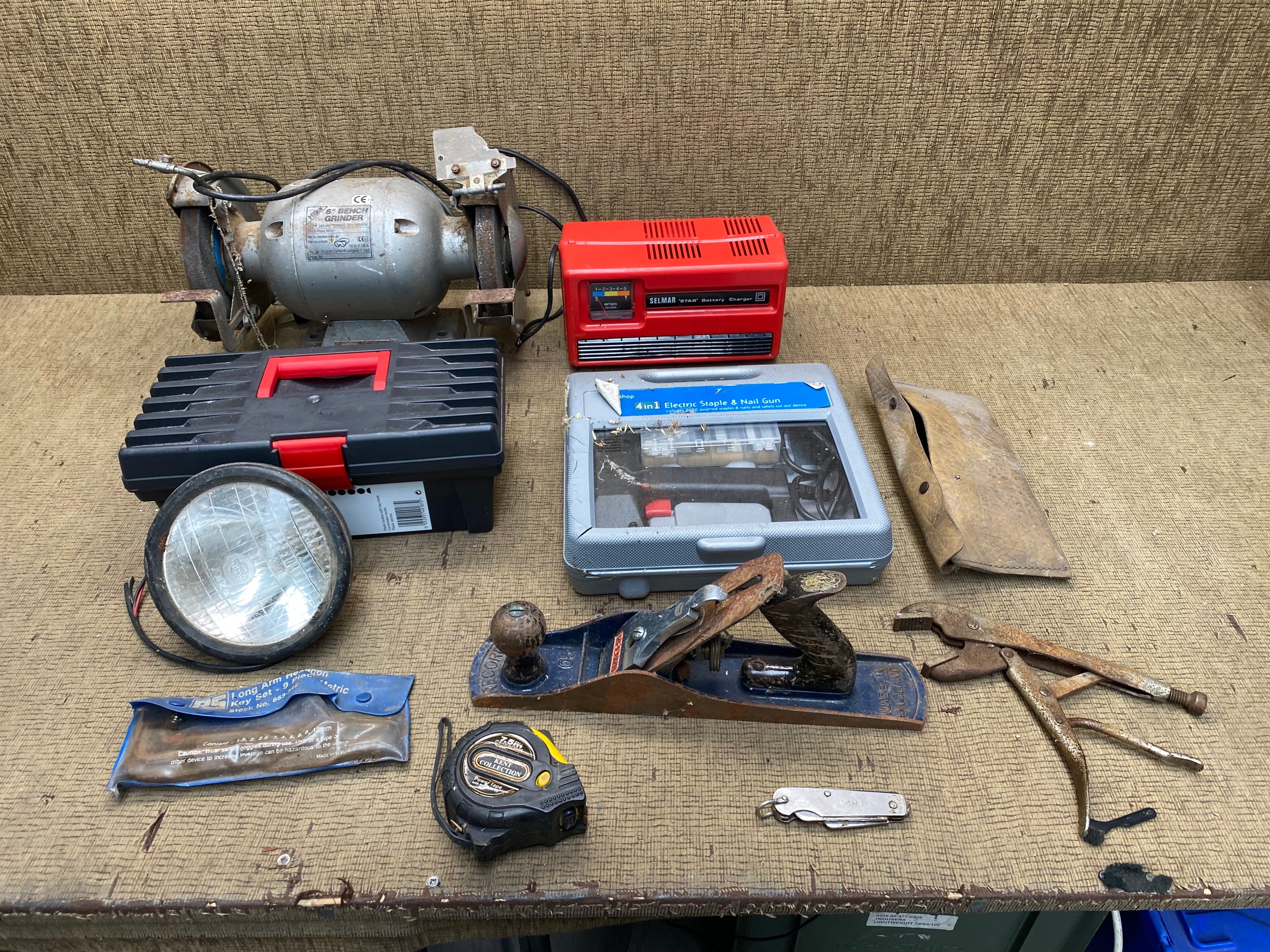 Mixed tools including: Bench Grinder, 4 in 1 staple gun and a tool box.