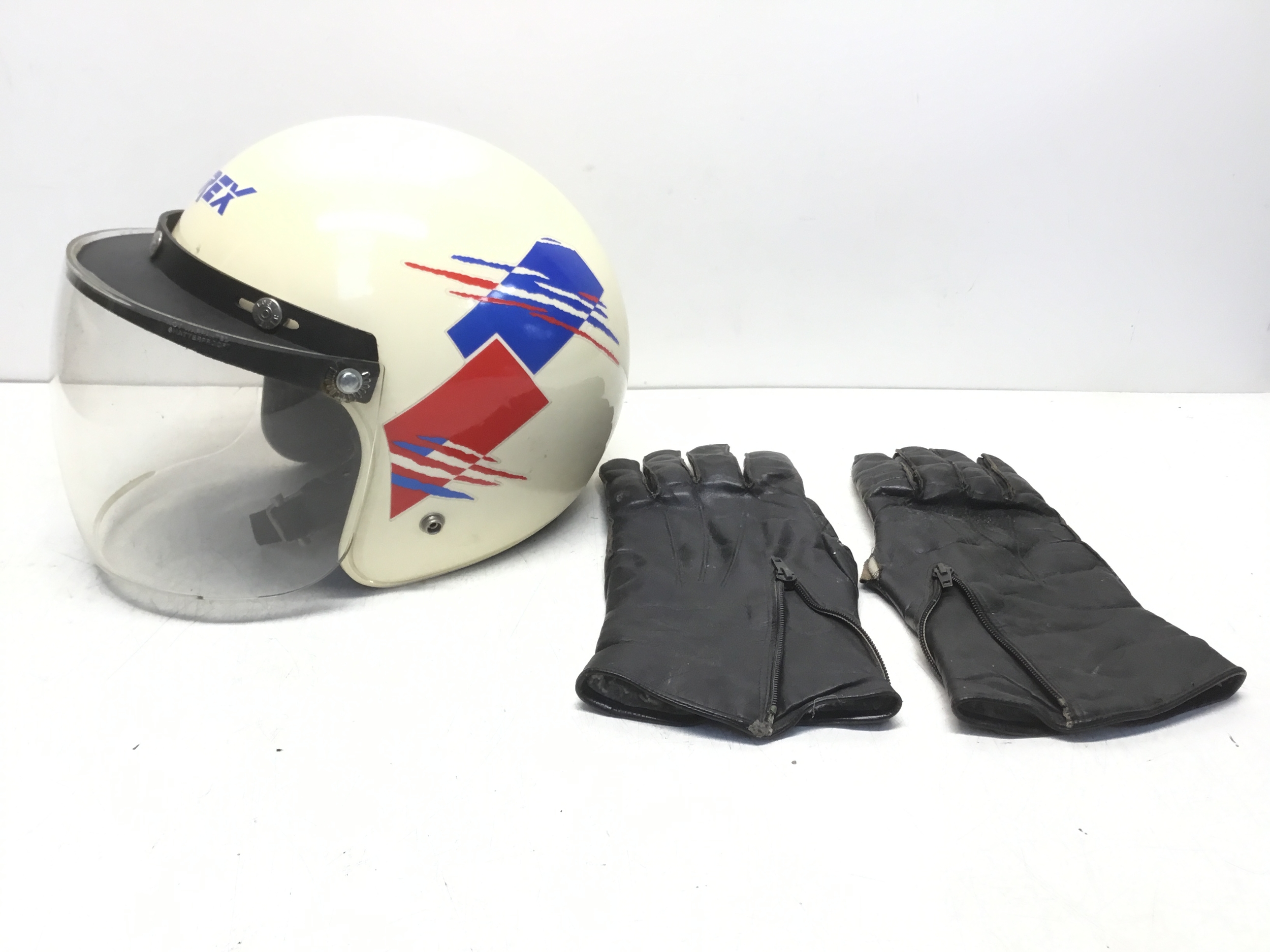 Vintage motorcycle open face helmet size XL and leather gauntlets