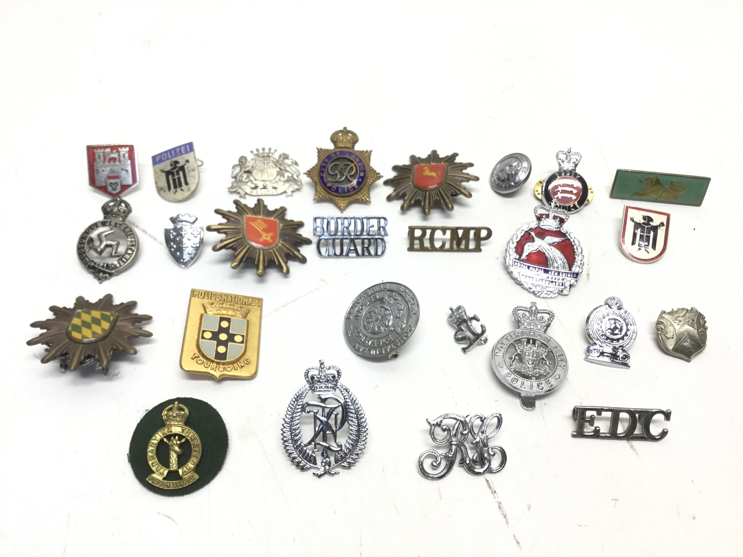 A collection of military/police/fire badges and buttons