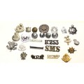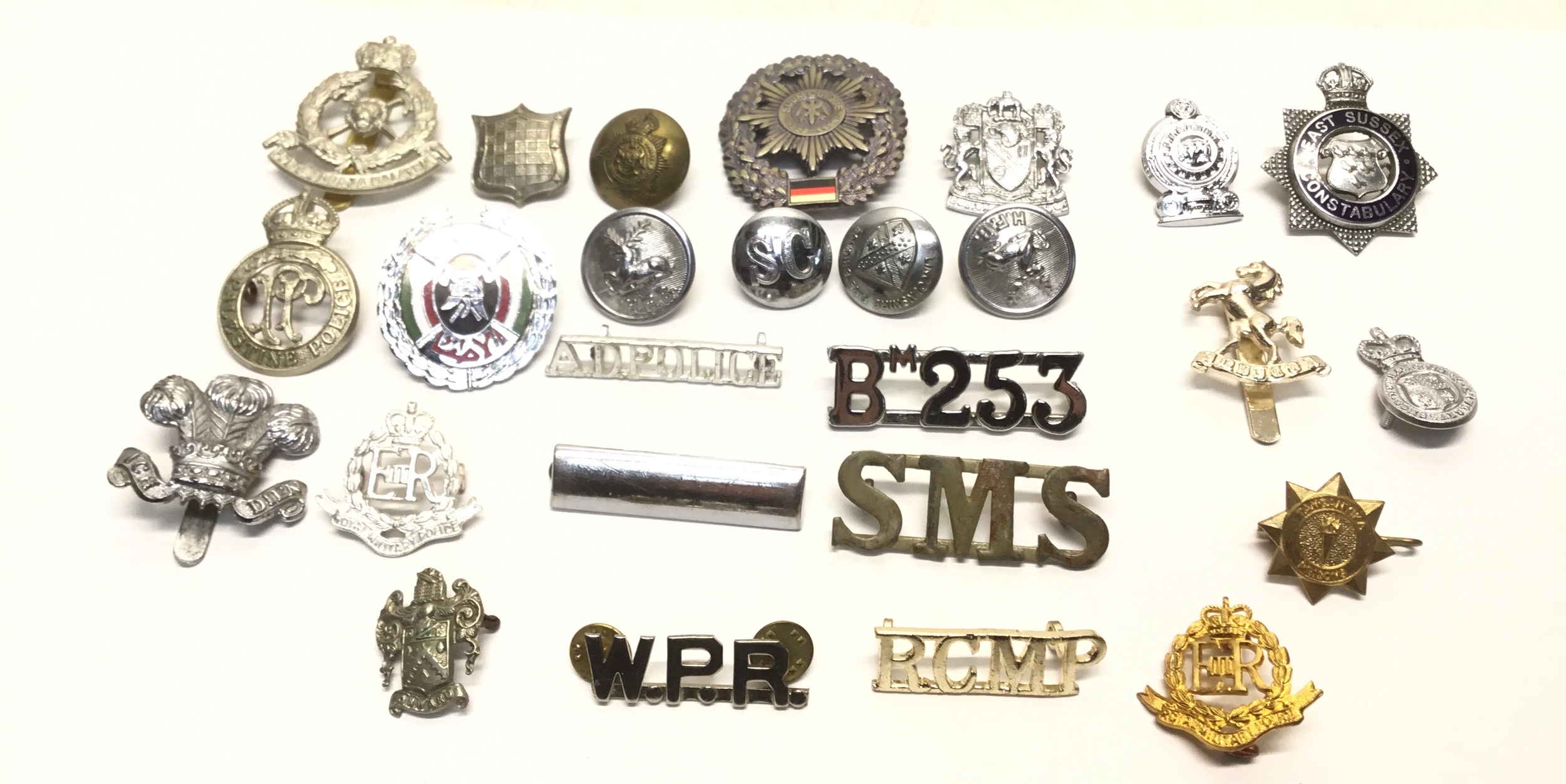 A collection of military/police/fire badges and buttons