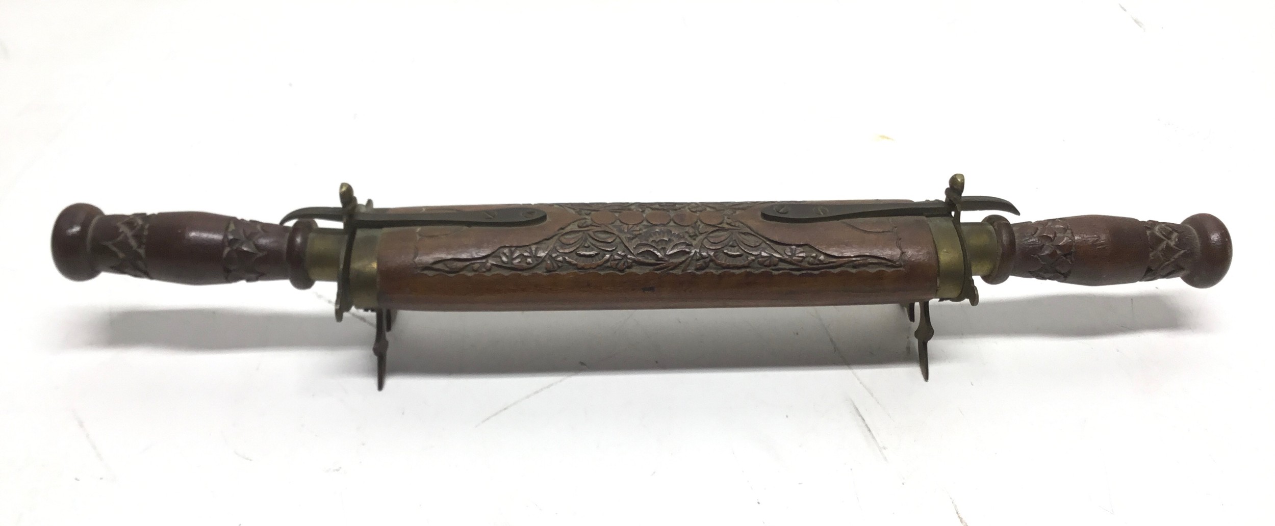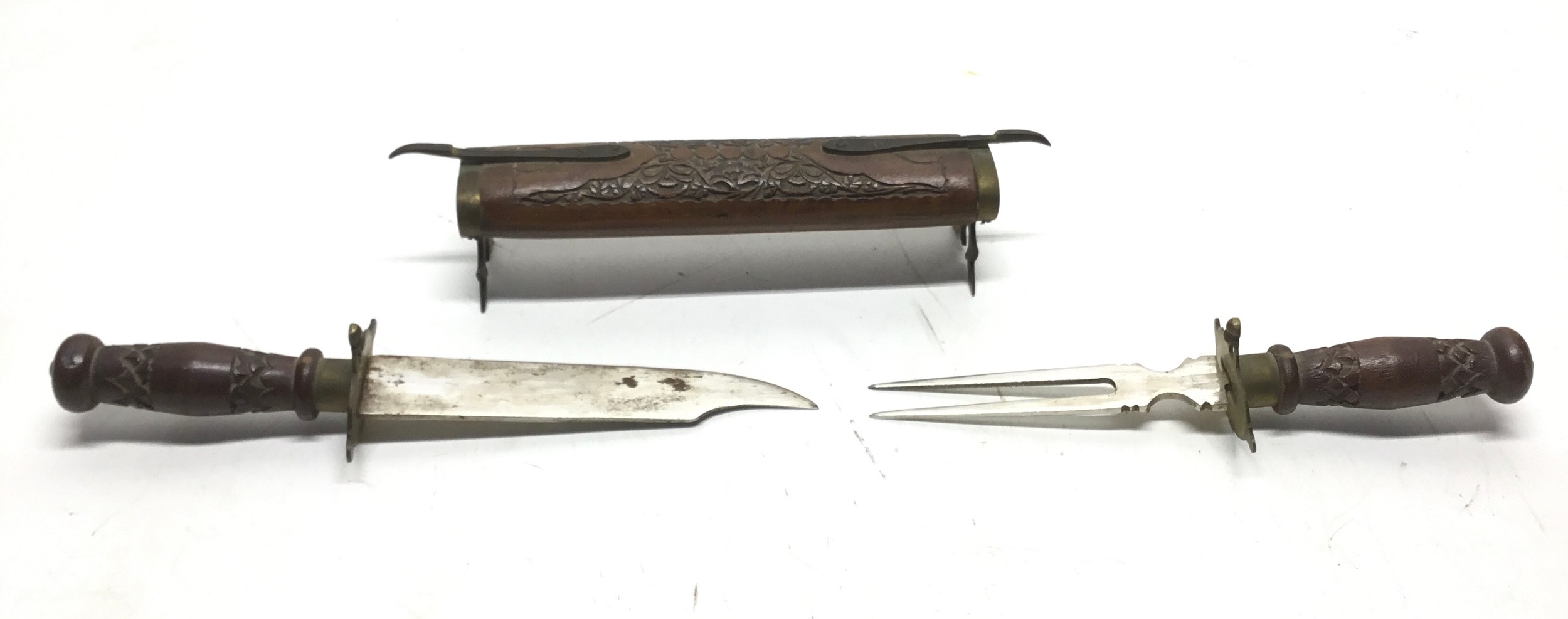 Vintage Hand-carved Traveling Knife and Fork carving Set Made in India Wood and Brass over 18’s collection only